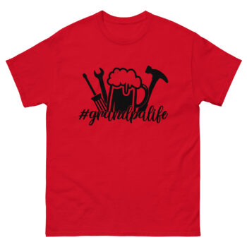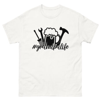 Celebrate the iconic #GrandpaLife with this humorous and relatable t-shirt! Featuring a foaming beer mug, wrench, BBQ spatula, and hammer, this shirt is perfect for the grandpa who loves tools, relaxing weekends, and a cold brew.