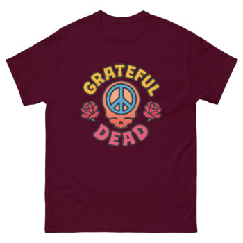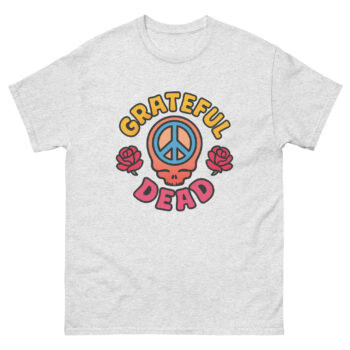 At the center, you see a red skull. Instead of being scary, it has a bright blue peace sign right inside it! This clever mix tells a powerful story: even though life doesn’t last forever (the skull), we can still choose peace and love (the peace sign). Next, two gorgeous red roses frame the skull, adding beauty and balance to the whole design. Finally, the words “Grateful” and “Dead” shine in warm, psychedelic colors that pop right off the fabric. Together, it creates a stunning psychedelic skull and roses band shirt that is both cool and deeply meaningful.