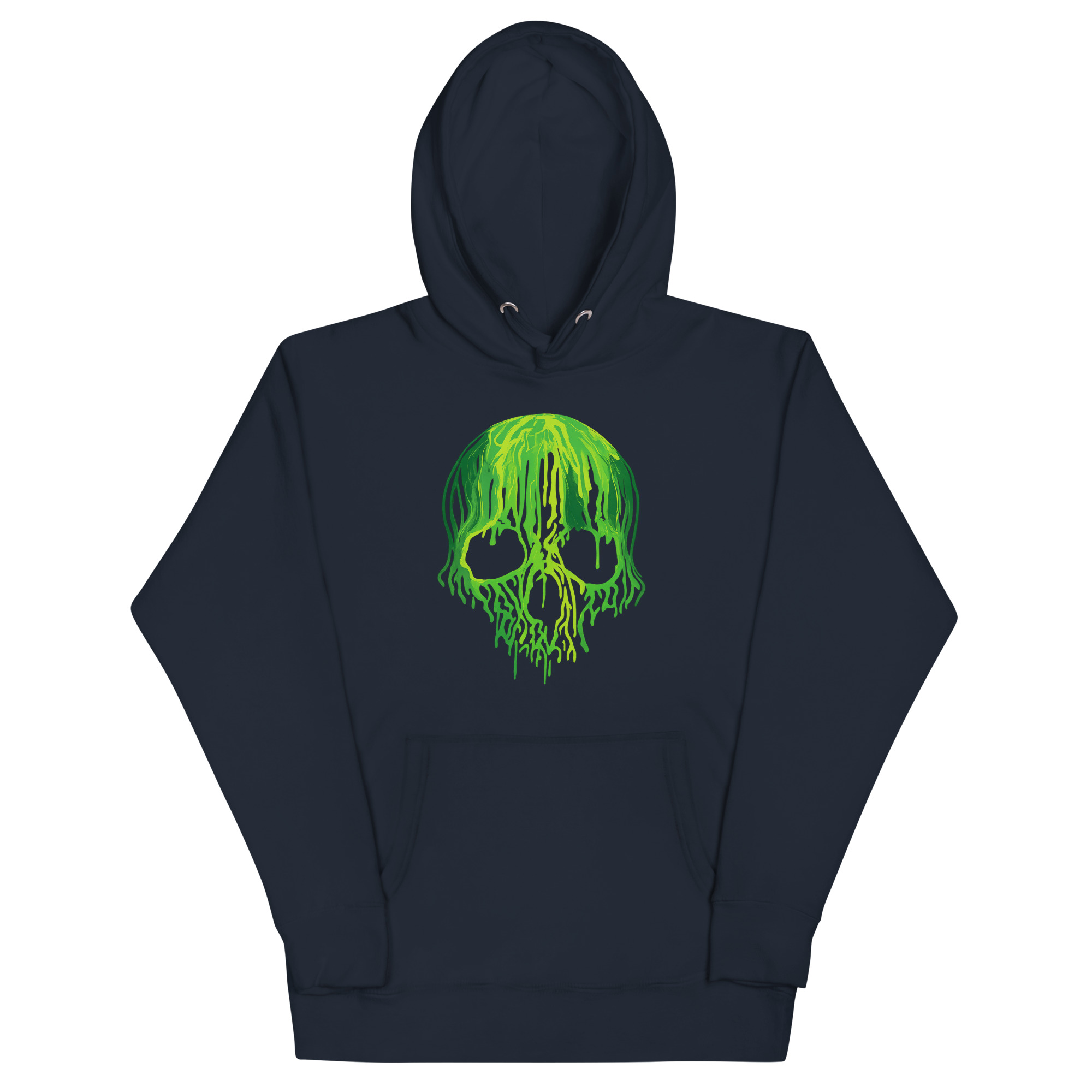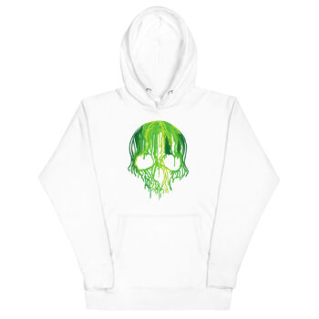 Let’s break down the art that makes this edgy streetwear hoodie so unique. The central graphic features a stylized skull, but forget what you know about traditional designs. This one is composed entirely of dripping, neon green and yellow lines that resemble toxic slime or a digital glitch.