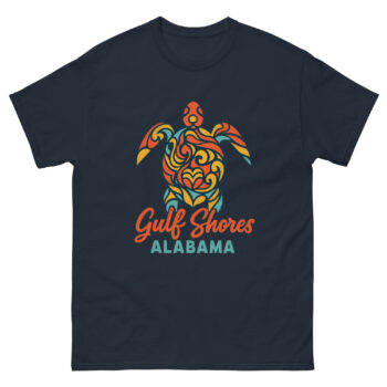 We didn’t just slap a generic design on a tee. We crafted a story. The centerpiece of this gulf shores turtle graphic shirt is a stunning, multicolor sea turtle, rendered in vibrant shades of fiery sunset orange, deep ocean blue, and radiant red. This isn’t a random choice; it’s an homage to the cherished marine life that defines the Alabama coast.