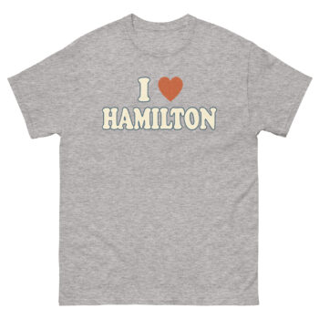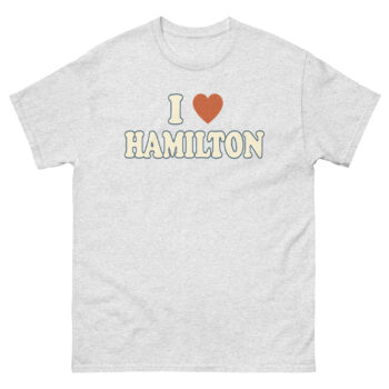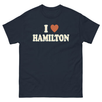 Show your love for Hamilton with this retro-inspired souvenir T-shirt. Featuring the bold “I ♥ Hamilton” design, it’s the perfect keepsake for travelers, locals, or anyone proud of the city. Comfortable, stylish, and versatile, this shirt makes a great everyday tee or thoughtful gift.