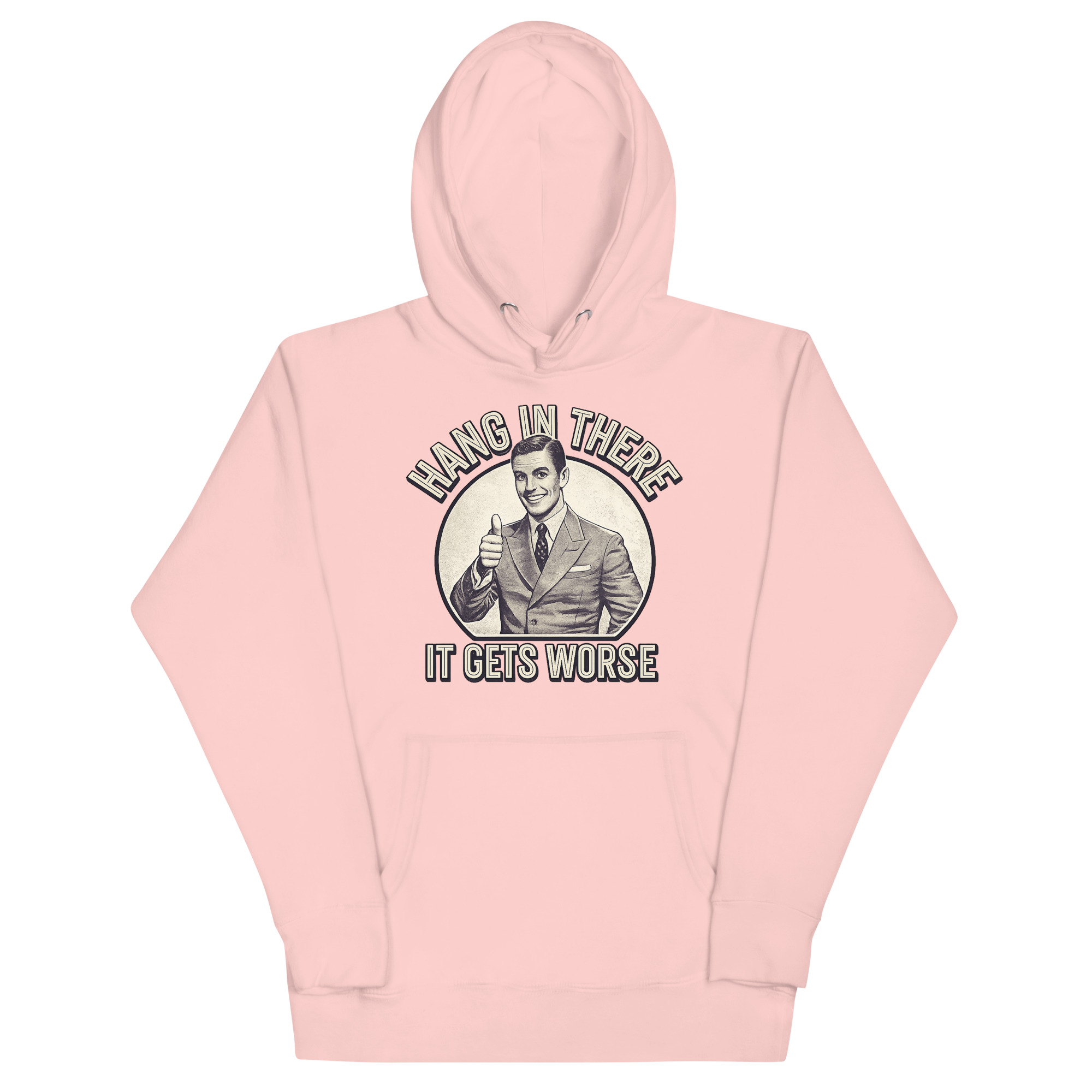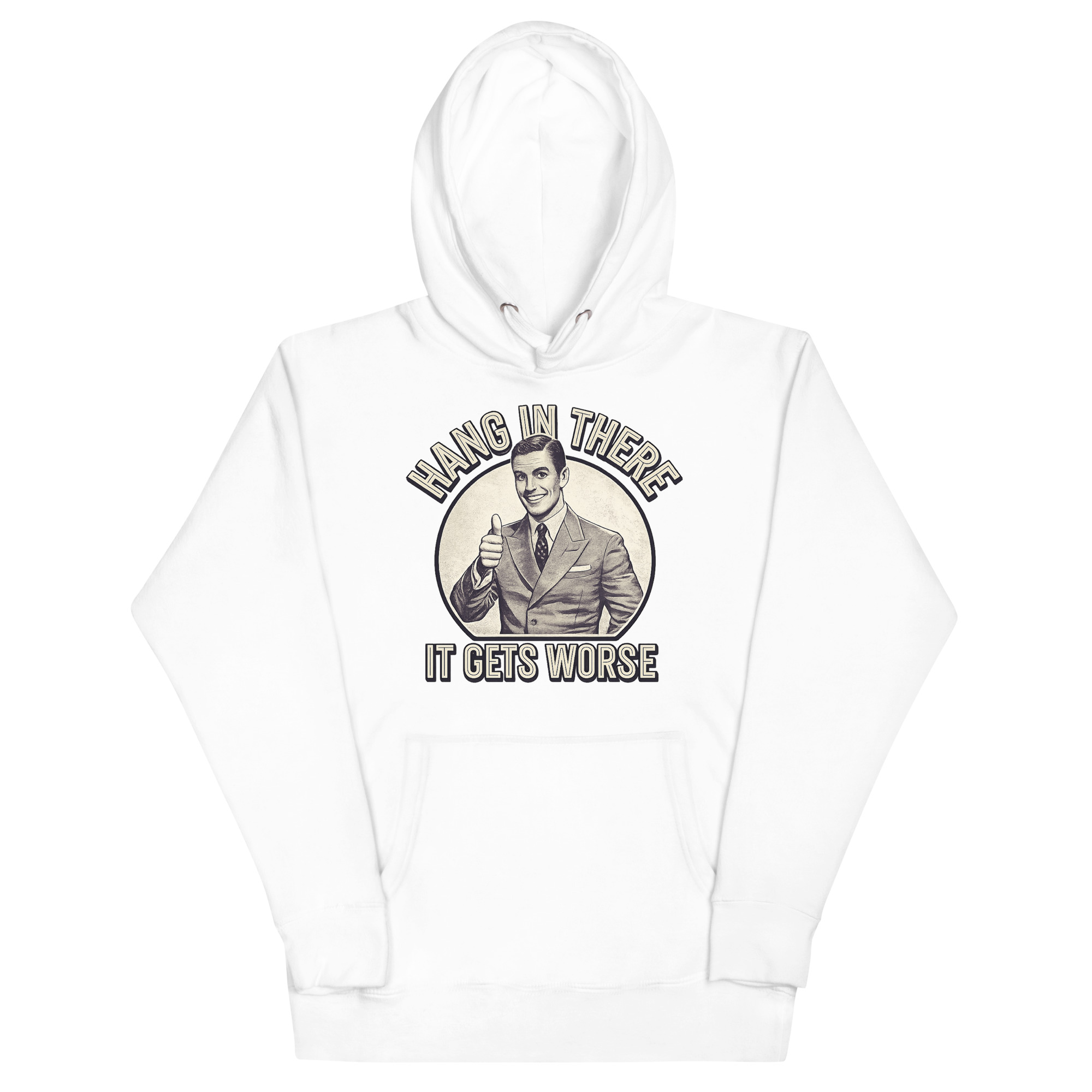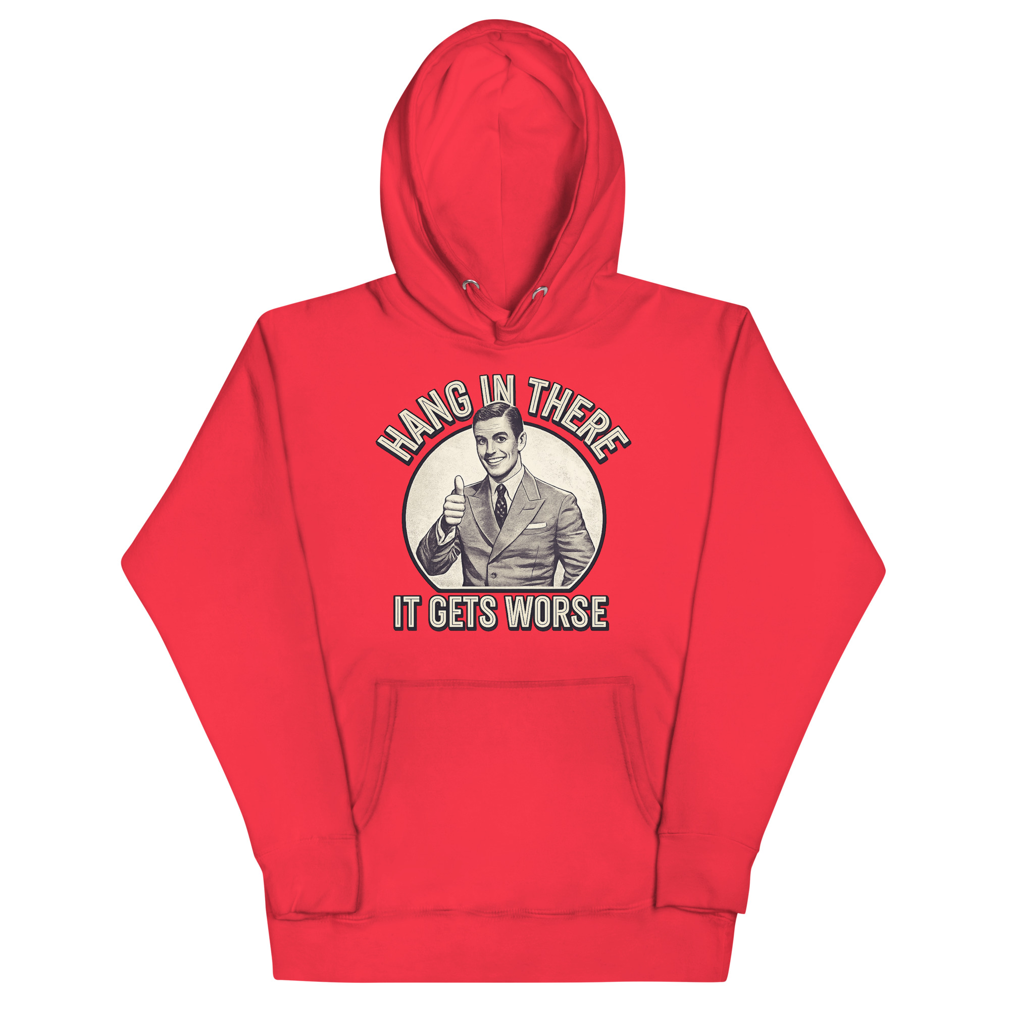 The Hang In There It Gets Worse Hoodie is a classic unisex pullover designed for fans of ironic humor and bold statements. Featuring a vintage-style thumbs-up graphic paired with a brutally honest message, this hoodie is perfect for those who appreciate sarcasm and want to wear it proudly. Ideal for students, creatives, and anyone with a taste for satirical fashion.
