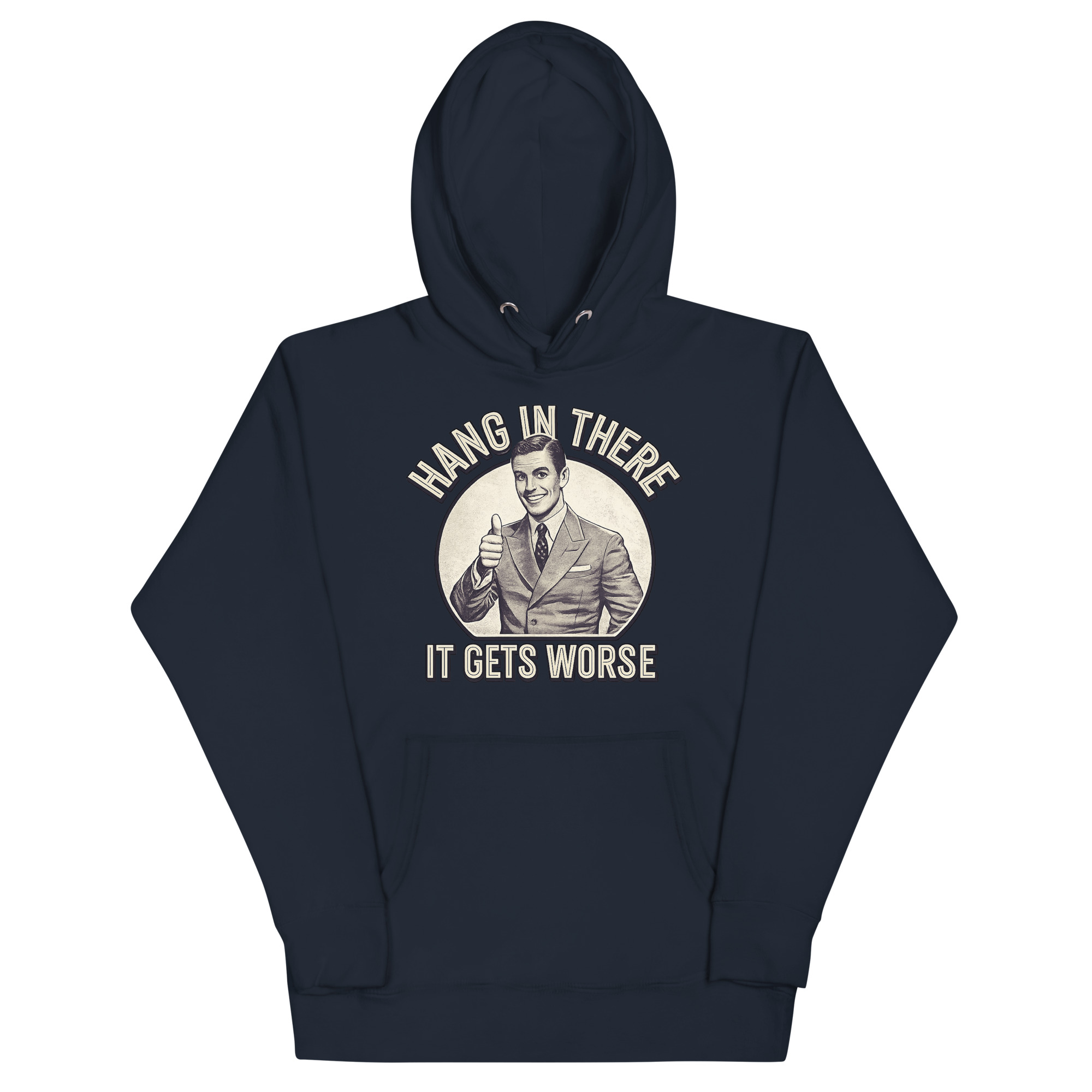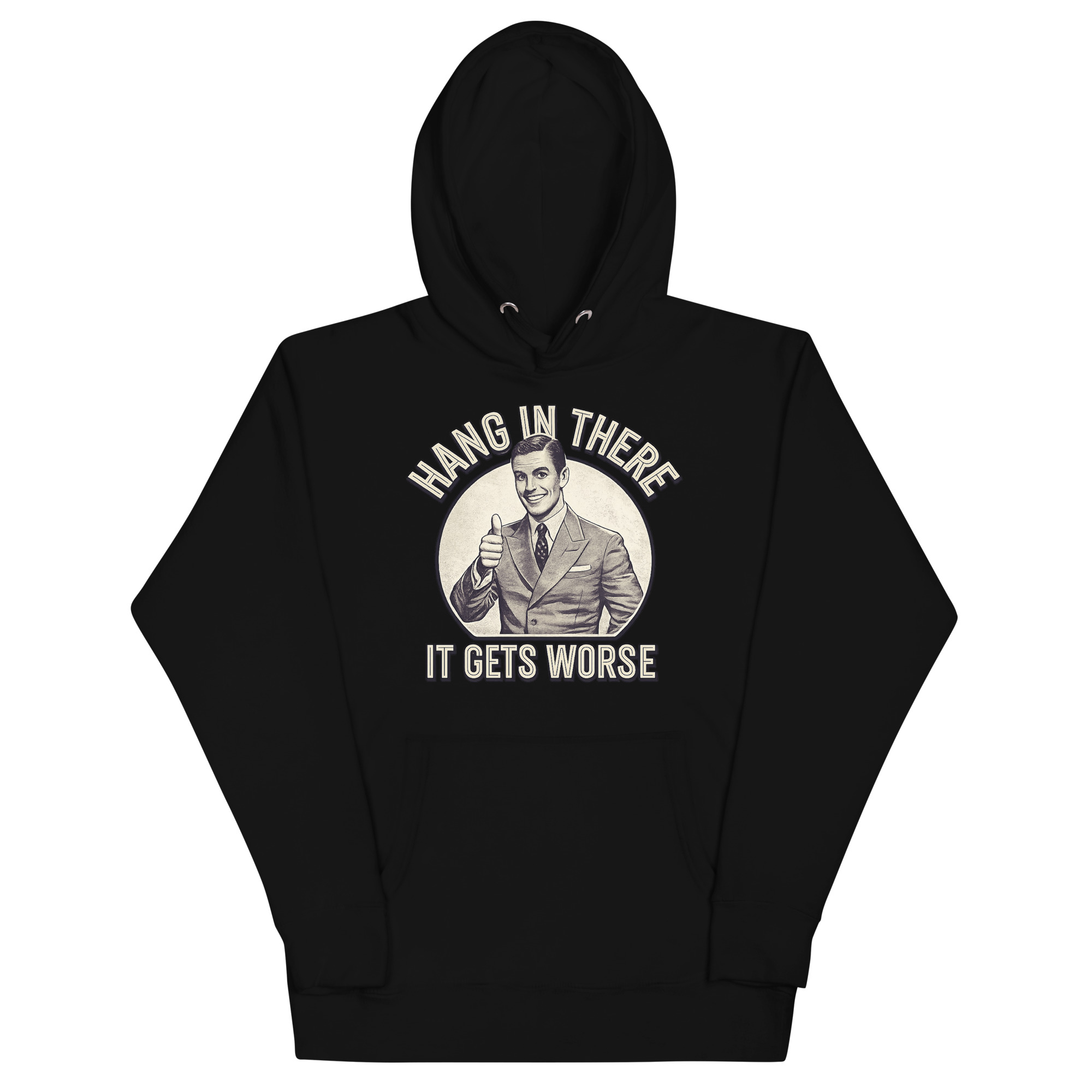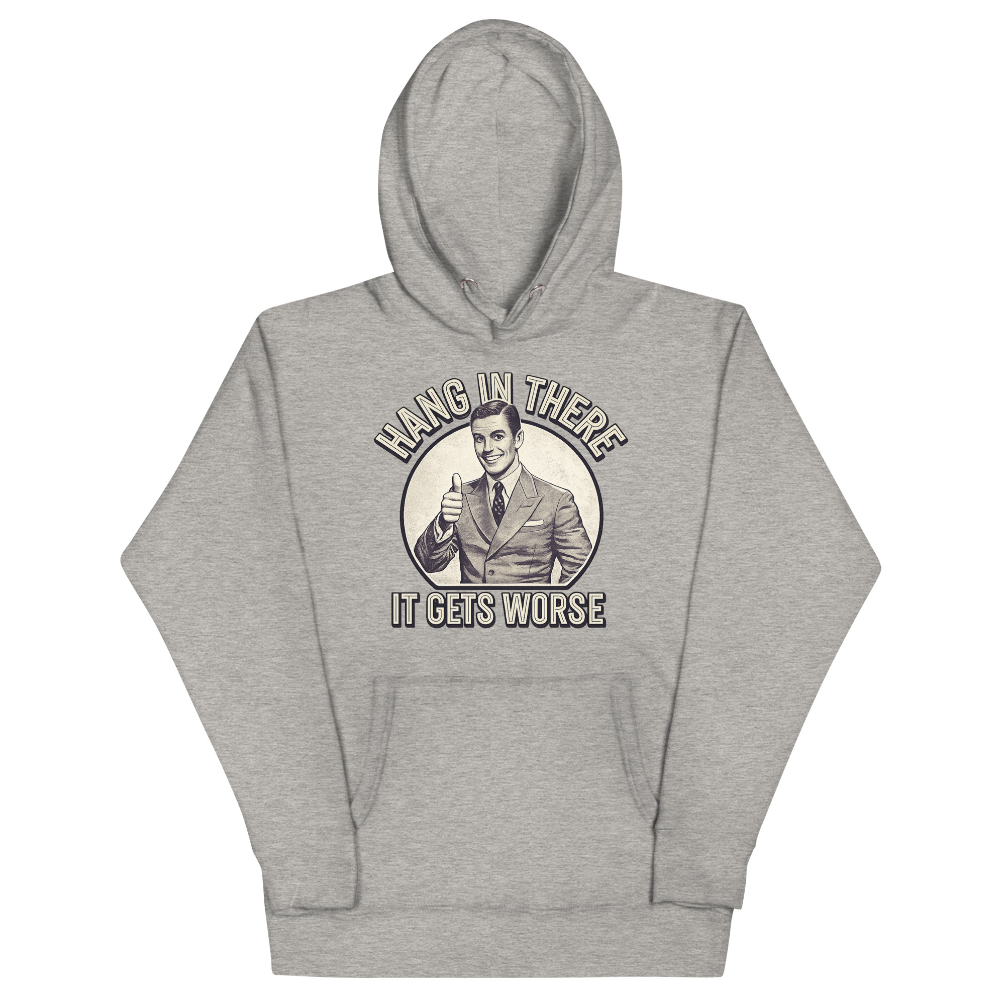 The Hang In There It Gets Worse Hoodie is a classic unisex pullover designed for fans of ironic humor and bold statements. Featuring a vintage-style thumbs-up graphic paired with a brutally honest message, this hoodie is perfect for those who appreciate sarcasm and want to wear it proudly. Ideal for students, creatives, and anyone with a taste for satirical fashion.