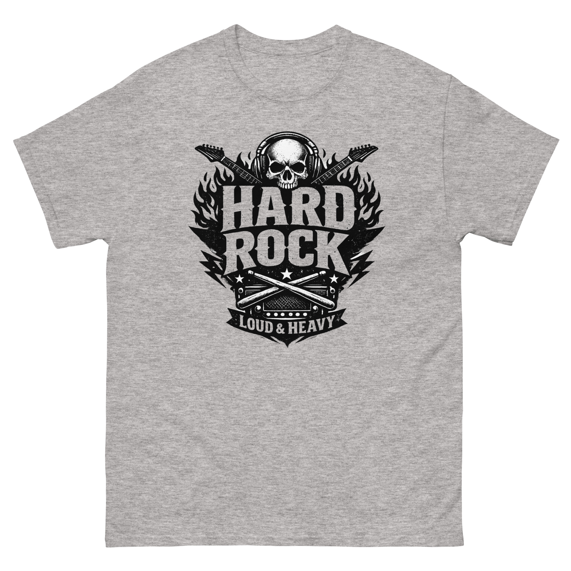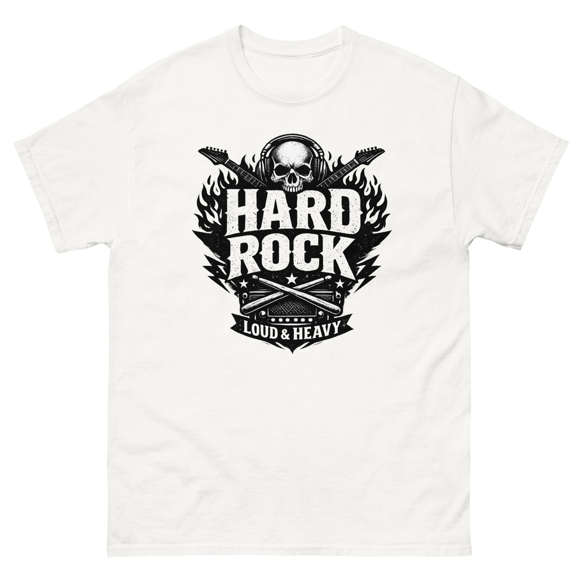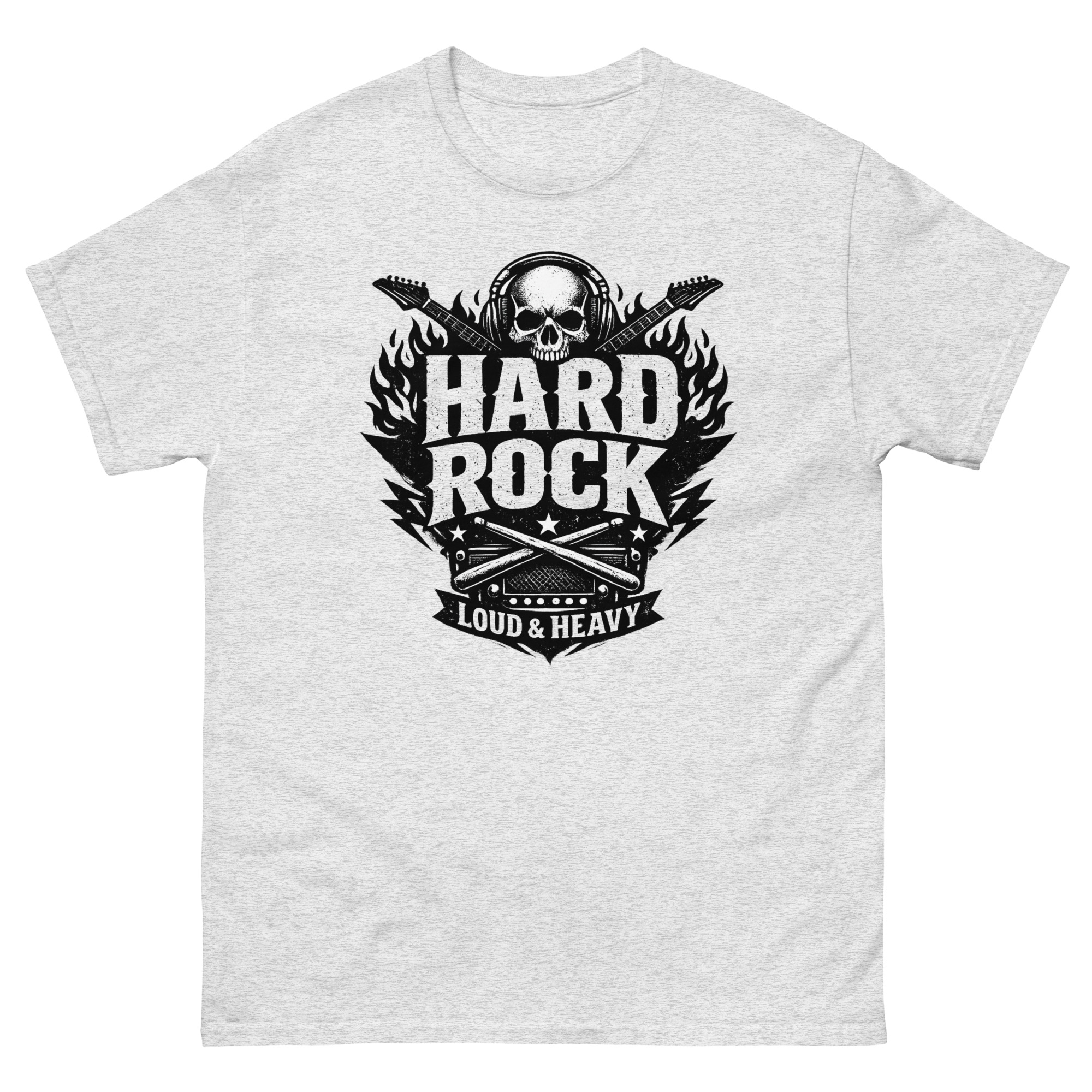 The skull wearing headphones represents total immersion in the music. Crossed electric guitars wrapped in flames capture the energy of a killer solo. Below, drumsticks and an amp symbolize the powerful rhythm section that drives every song. The distressed, monochrome finish makes it look like a well-loved concert find, placing it firmly in the category of authentic rock n roll concert merchandise. Hard Rock T Shirt It’s a tribute to the purists, making it perfect biker style rock and roll apparel.