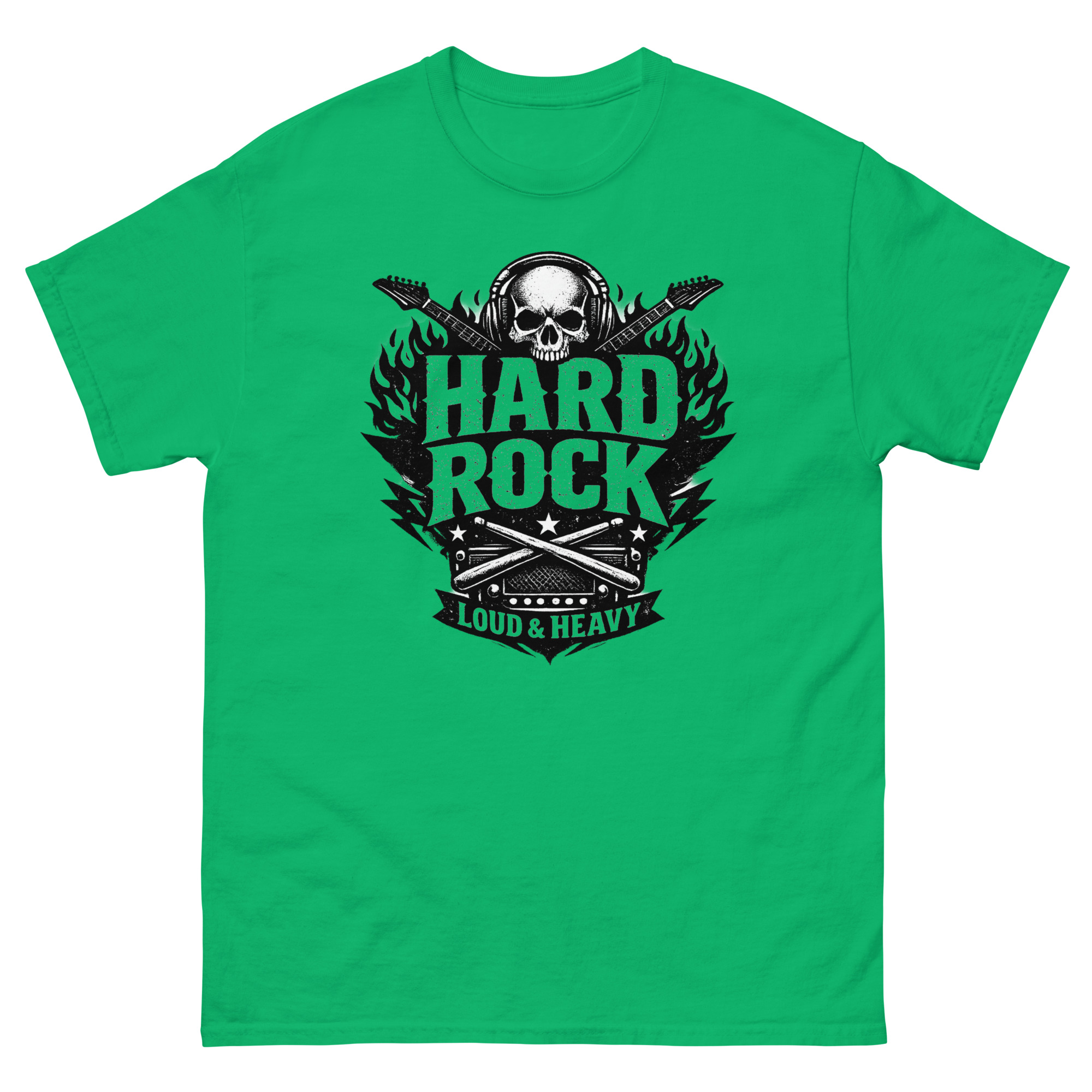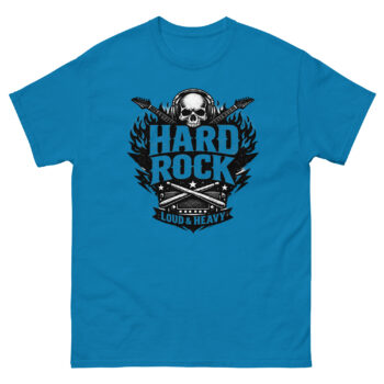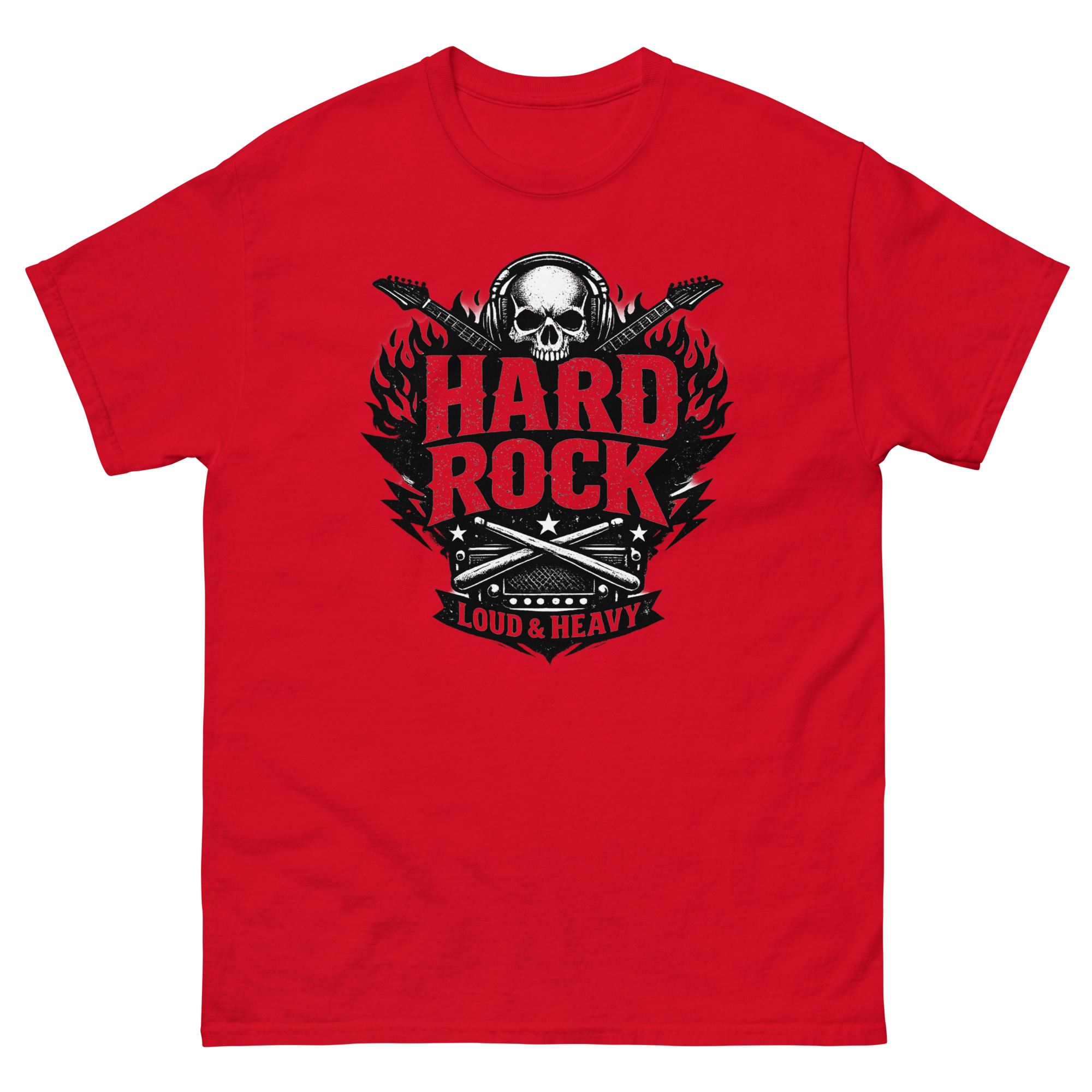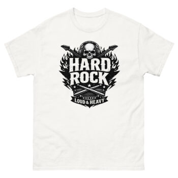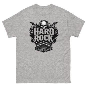 This hard rock t shirt is a heavyweight cotton tee built for music fans. Its unique feature is a detailed, vintage-style graphic that combines a skull, flaming guitars, and classic rock gear into one bold statement. If you live for loud music and authentic style, this shirt is designed for you.