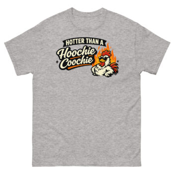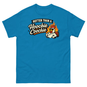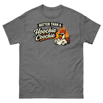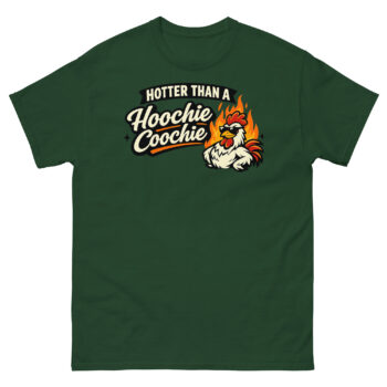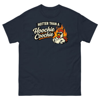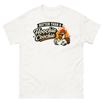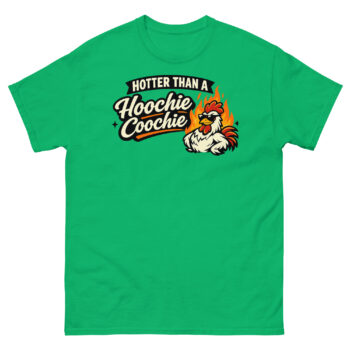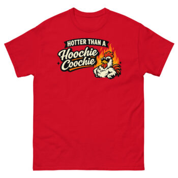 The hotter than a hoochie coochie shirt isn’t just a tee, it’s a statement. Inspired by playful Southern slang and fiery confidence, this design features a cartoon chicken strutting in front of stylized flames. It’s cheeky, it’s bold, and it’s made to spark smiles. Whether you’re channeling your inner sass or just love a good laugh, this shirt brings the heat.