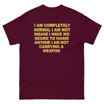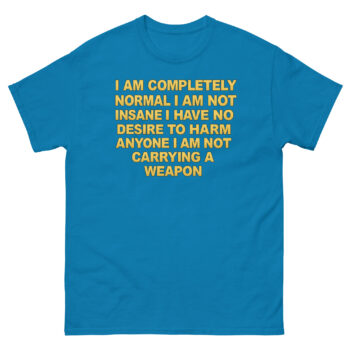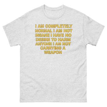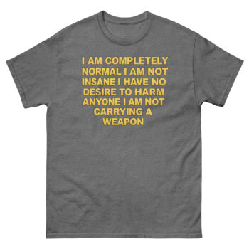 I Am Completely Normal Shirt offers a reliable, classic fit that’s comfortable for all-day wear. The 100% cotton is breathable and softens naturally over time. Furthermore, the tubular construction helps the tee keep its shape wash after wash. The DTG printing method means the text feels soft and integrated into the fabric.