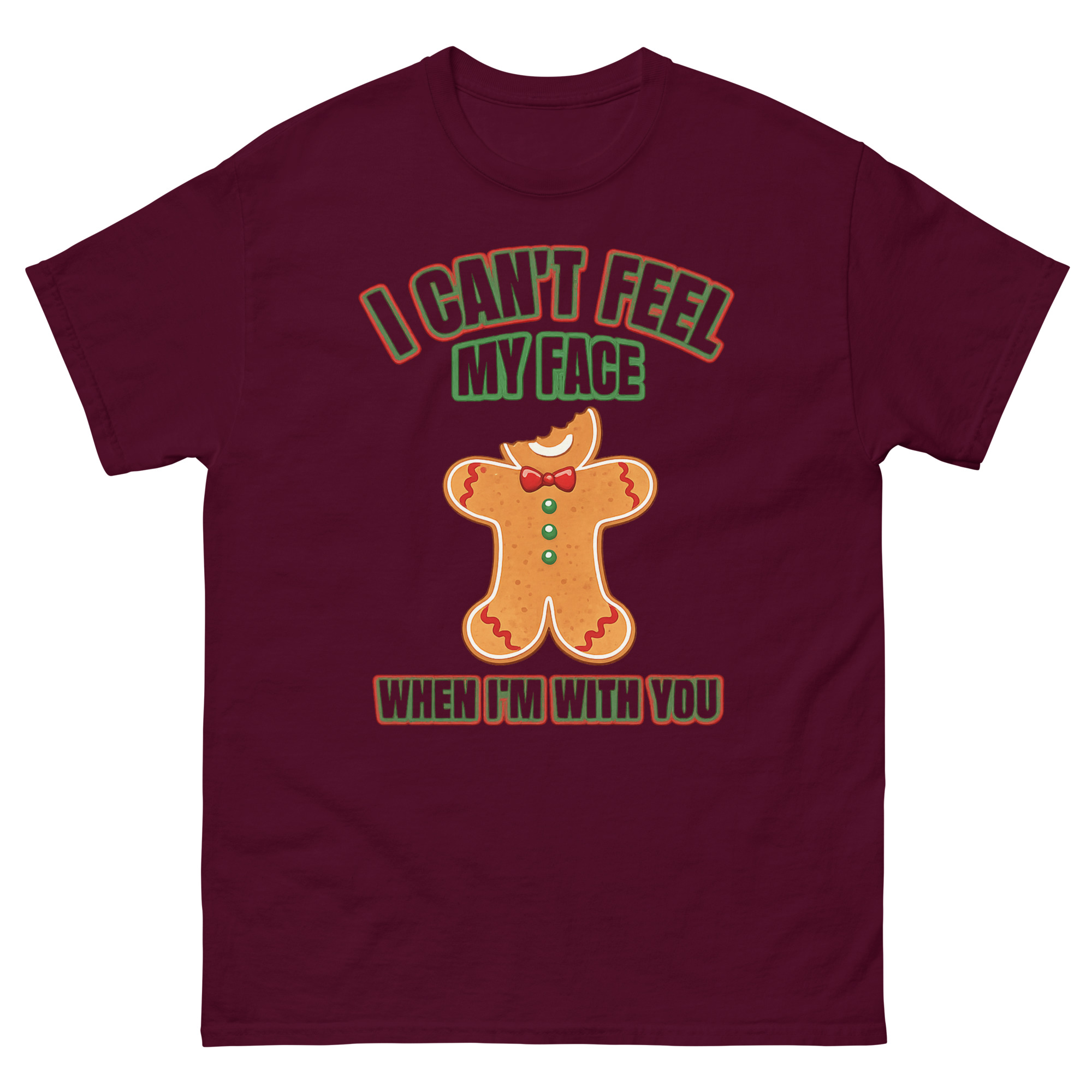 This I Can’t Feel My Face Shirt design started with a simple, funny observation: what if you took a lyric about being blissfully numb and applied it literally to a gingerbread man missing a bite? That’s the core of this shirt. Instead of a typical holiday graphic, we wanted something that would make people do a double-take and then laugh. The bitten cookie, paired with the bold, festive lettering, creates that perfect “festive irony.” It’s for the person who appreciates witty humor and would rather wear a clever conversation starter than a generic snowman design.