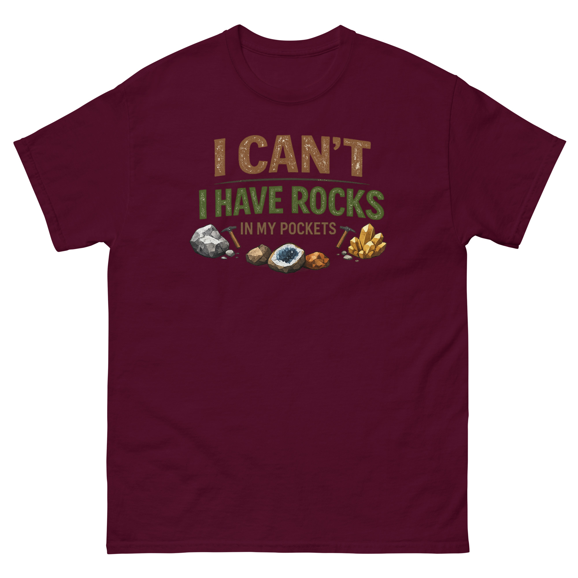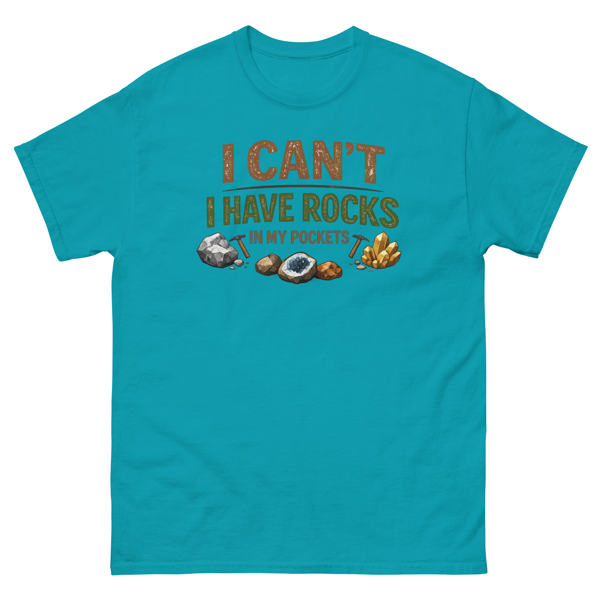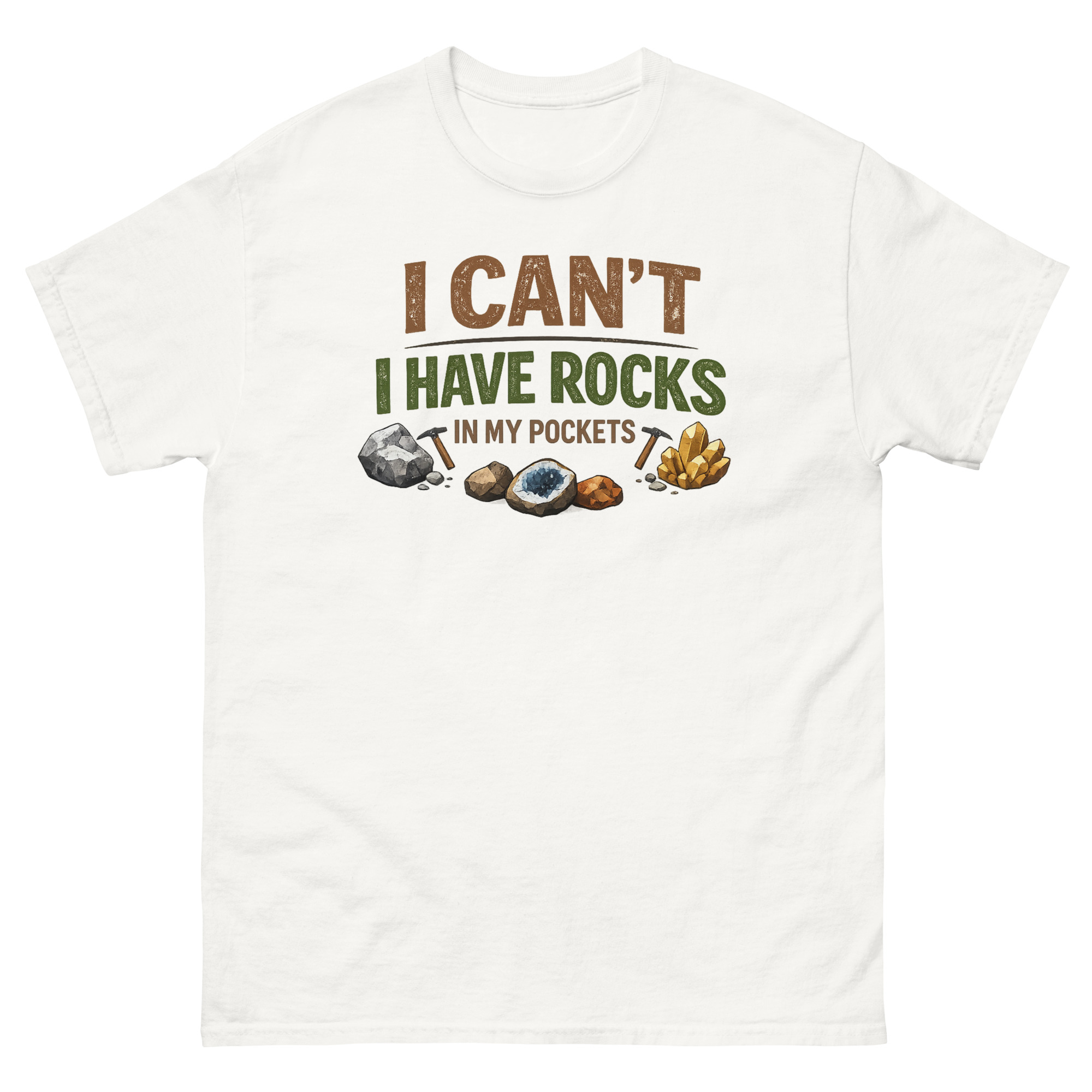 I Can’t I Have Rocks in My Pockets T Shirt Available in sizes S through 5XL. For the best fit, please check our detailed size chart on the product page. These are standard unisex sizes. If you prefer a looser fit for layering over a flannel or for maximum mobility, consider ordering one size up.
