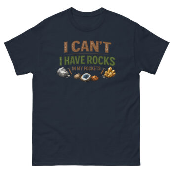 We created I Can’t I Have Rocks in My Pockets T Shirt to celebrate the very real “weight” of a rockhound’s passion. Our philosophy, “The Weight of the Passion,” humorously addresses how a day of fieldwork can leave you physically and happily, burdened. The inspiration comes from the shared experience of having to decline plans because you’re busy cataloging or simply too weighed down by your latest finds.