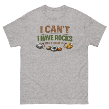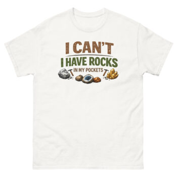 This is the I Can’t I Have Rocks in My Pockets T Shirt, a witty and relatable tee for anyone who loves collecting specimens. Its unique design pairs vintage distressed typography with detailed illustrations of a geode, quartz, and other minerals. This shirt is designed for rockhounds, amateur geologists, earth science teachers, and anyone whose pockets are always full of treasures.