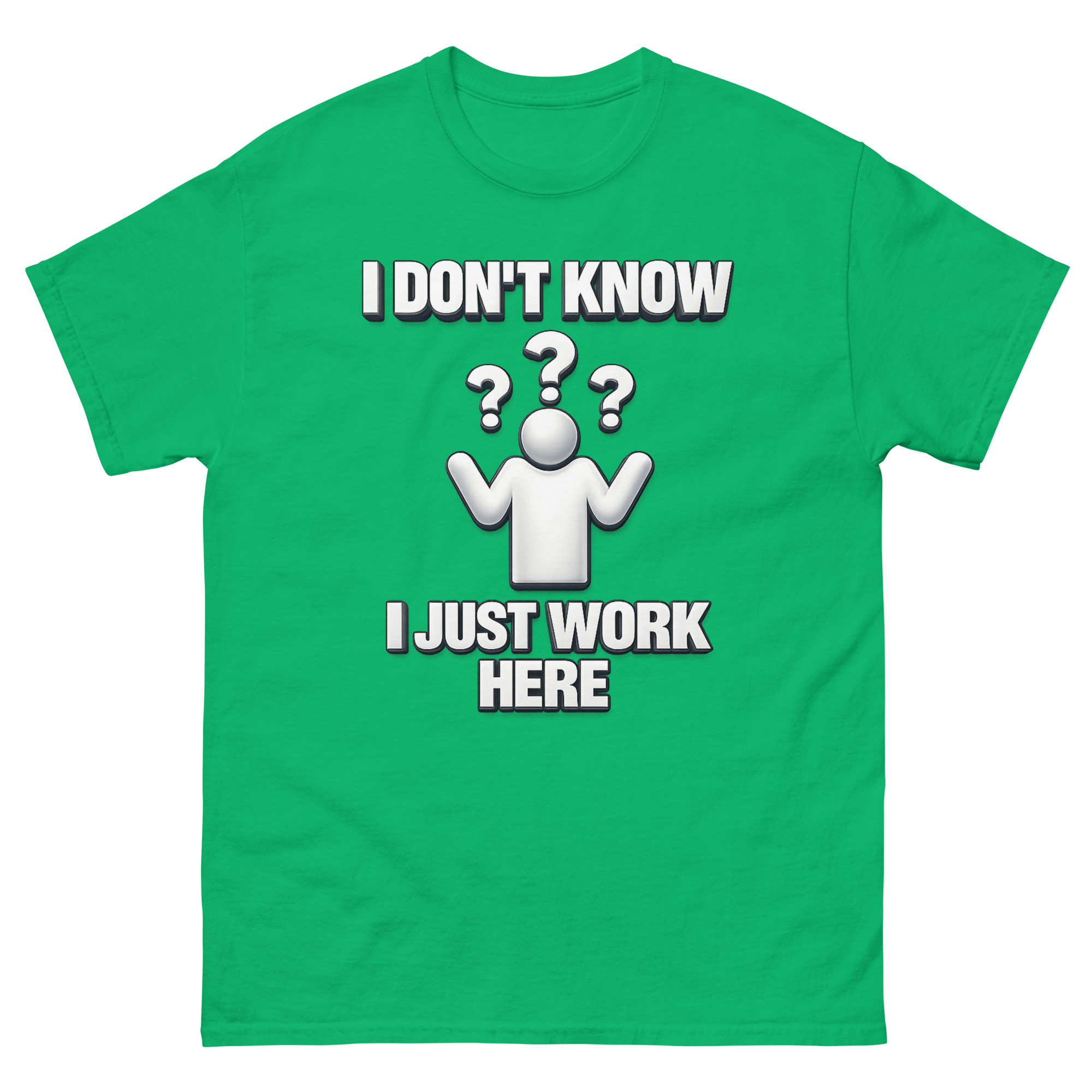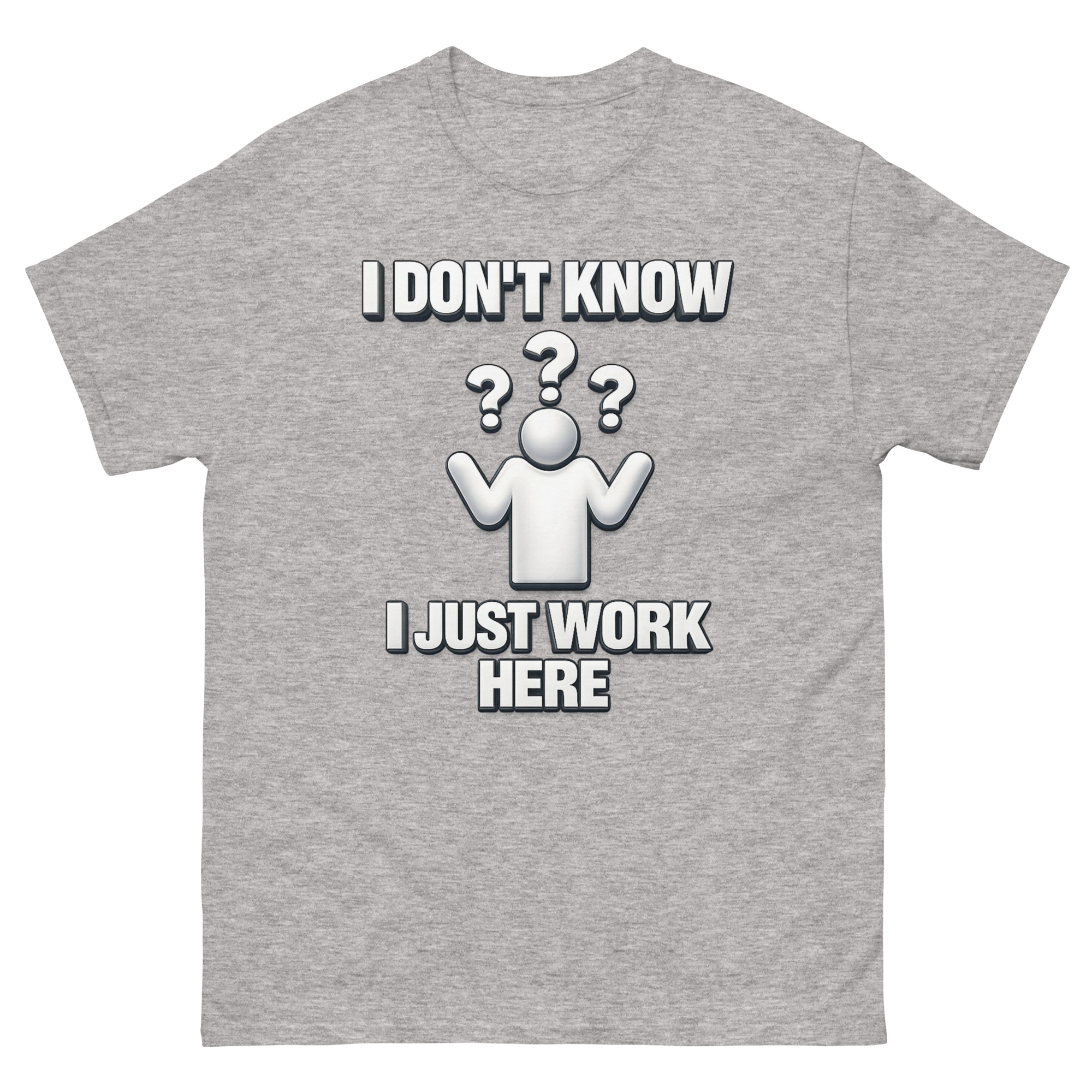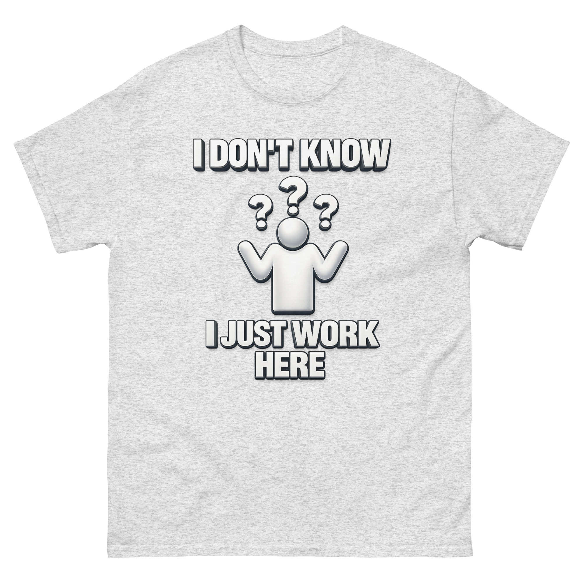 We didn’t invent the sentiment, we just put it on a really soft tee. I Don’t Know I Just Work Here Shirt design was inspired by that specific, shared moment when you’re asked a question you simply cannot answer. The clean, 3D-style shrugging figure surrounded by floating question marks taps into a bit of early 2000s office aesthetic, making it feel familiar and ironically professional. It’s less about being unhelpful and more about quietly acknowledging the absurdities of any job. This makes it a perfect funny retirement gift for cynical corporate employees or a sarcastic work anniversary present for retail staff who’ve earned the right to a chuckle.