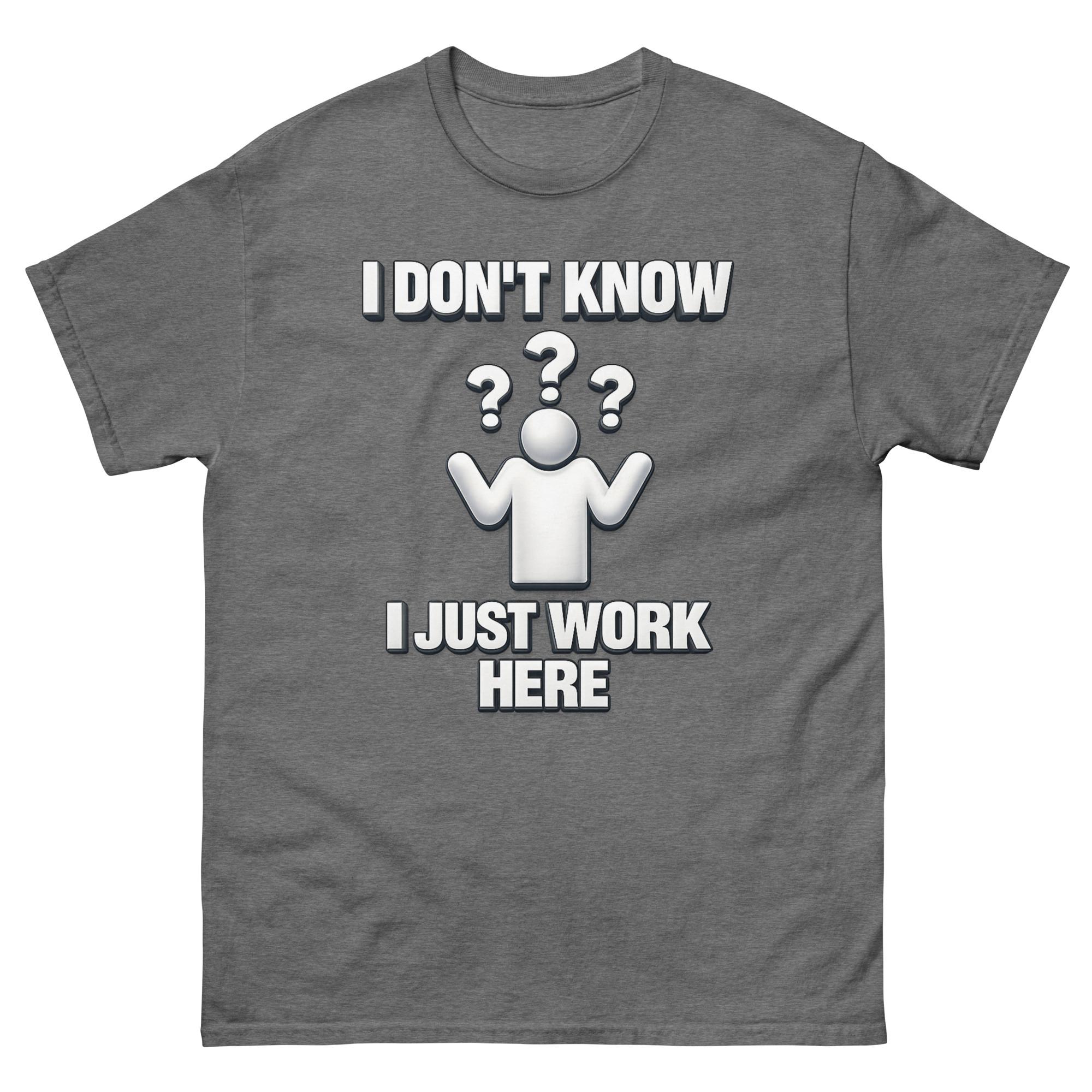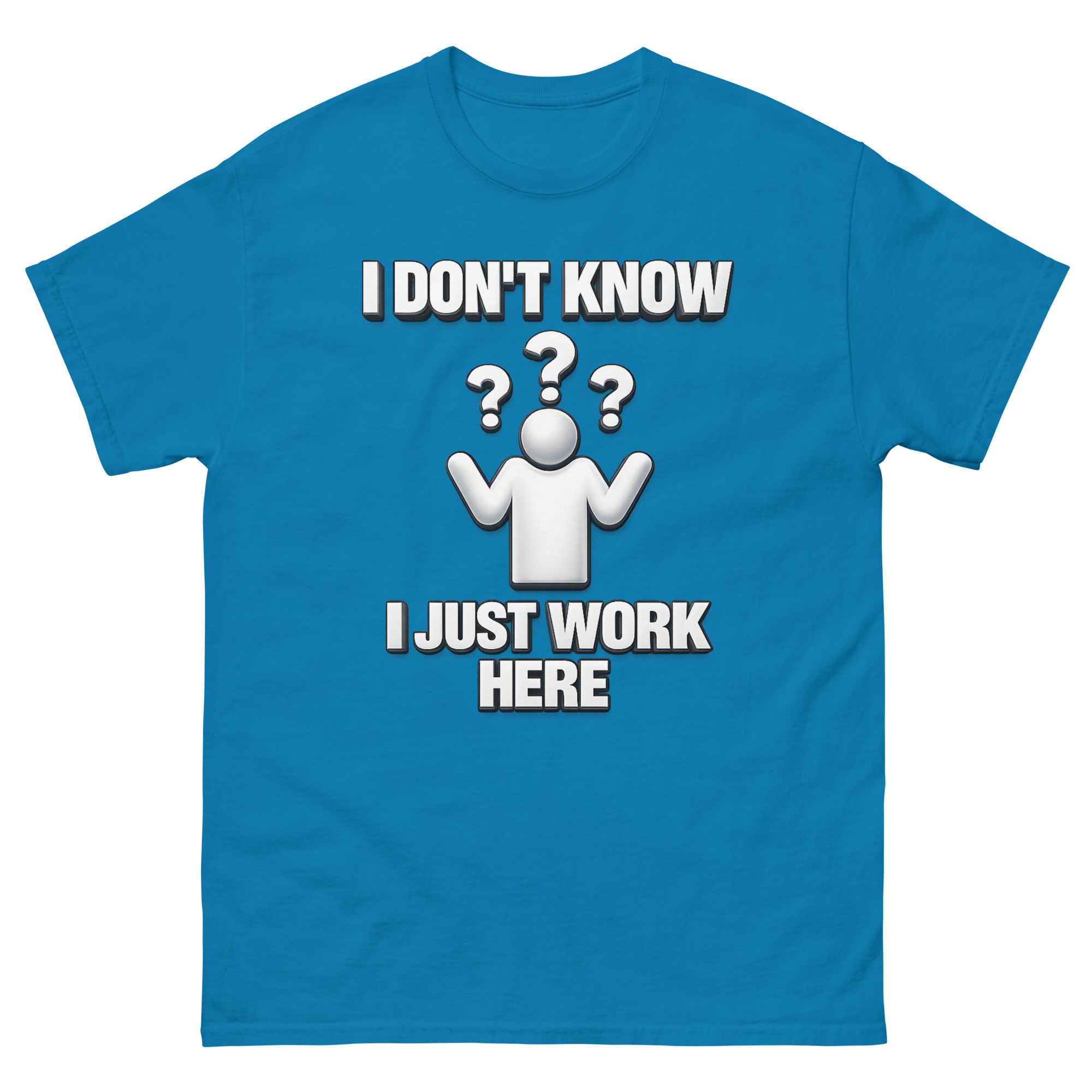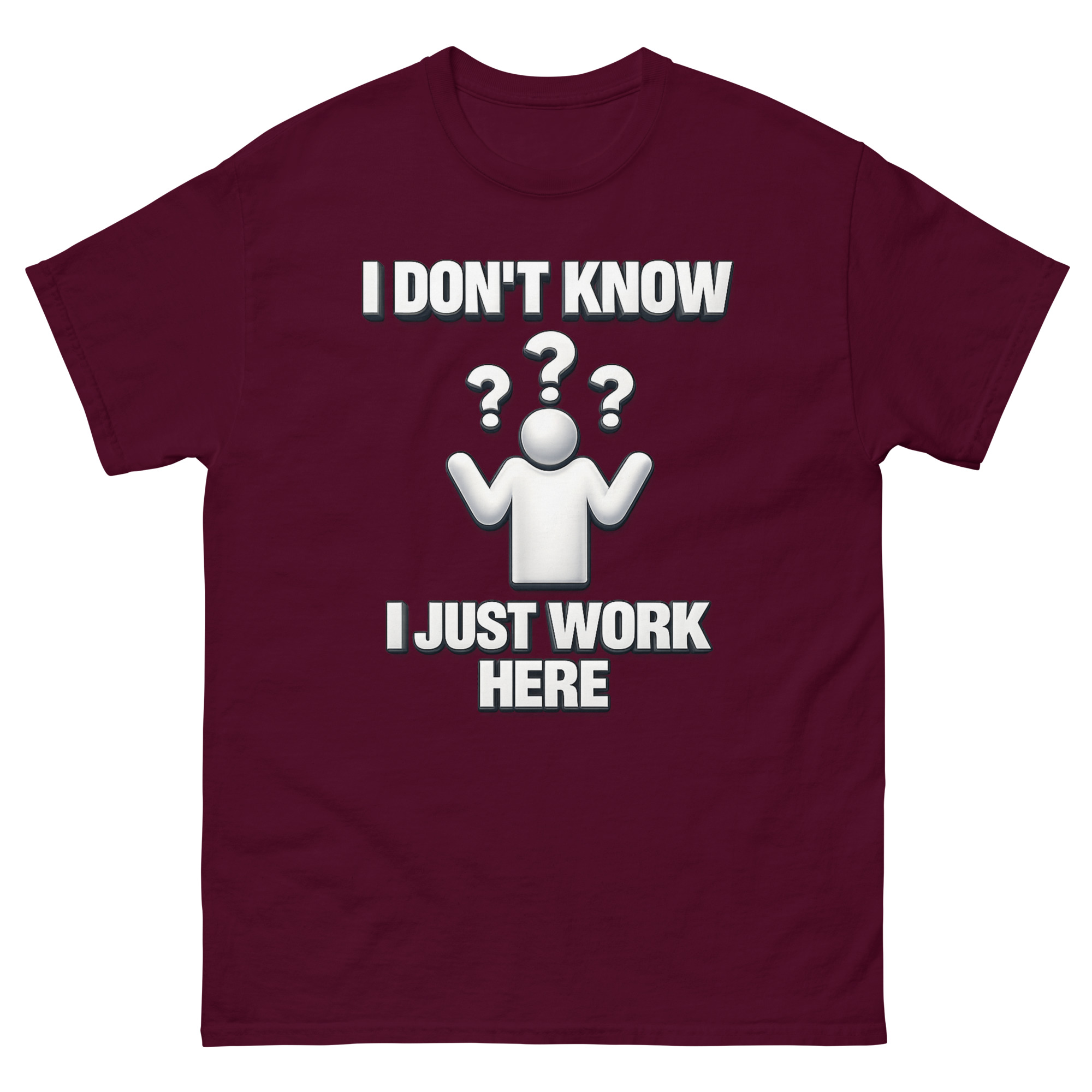 We didn’t invent the sentiment, we just put it on a really soft tee. I Don’t Know I Just Work Here Shirt design was inspired by that specific, shared moment when you’re asked a question you simply cannot answer. The clean, 3D-style shrugging figure surrounded by floating question marks taps into a bit of early 2000s office aesthetic, making it feel familiar and ironically professional. It’s less about being unhelpful and more about quietly acknowledging the absurdities of any job. This makes it a perfect funny retirement gift for cynical corporate employees or a sarcastic work anniversary present for retail staff who’ve earned the right to a chuckle.