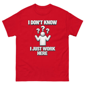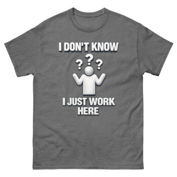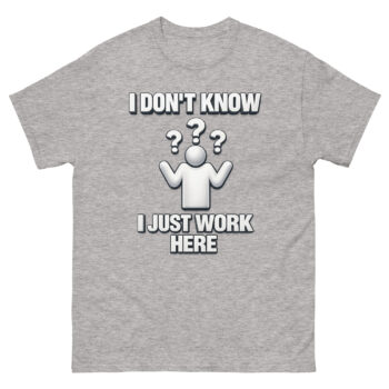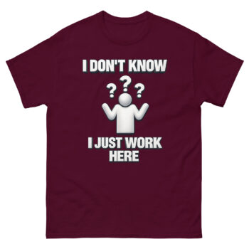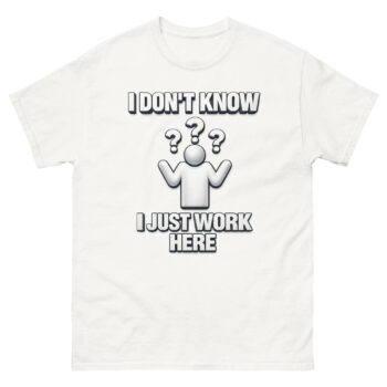 This is the I Don’t Know I Just Work Here Shirt, a classic cotton tee designed for anyone who needs a lighthearted way to set workplace boundaries. What sets it apart is its unique, clean design that blends corporate clip-art nostalgia with a genuinely relatable message. It’s crafted for employees across retail, IT, customer service, and corporate offices who appreciate a bit of humorous dissociation. Ultimately, this shirt offers a comfortable, high-quality way to express that universal feeling of being out of the loop.