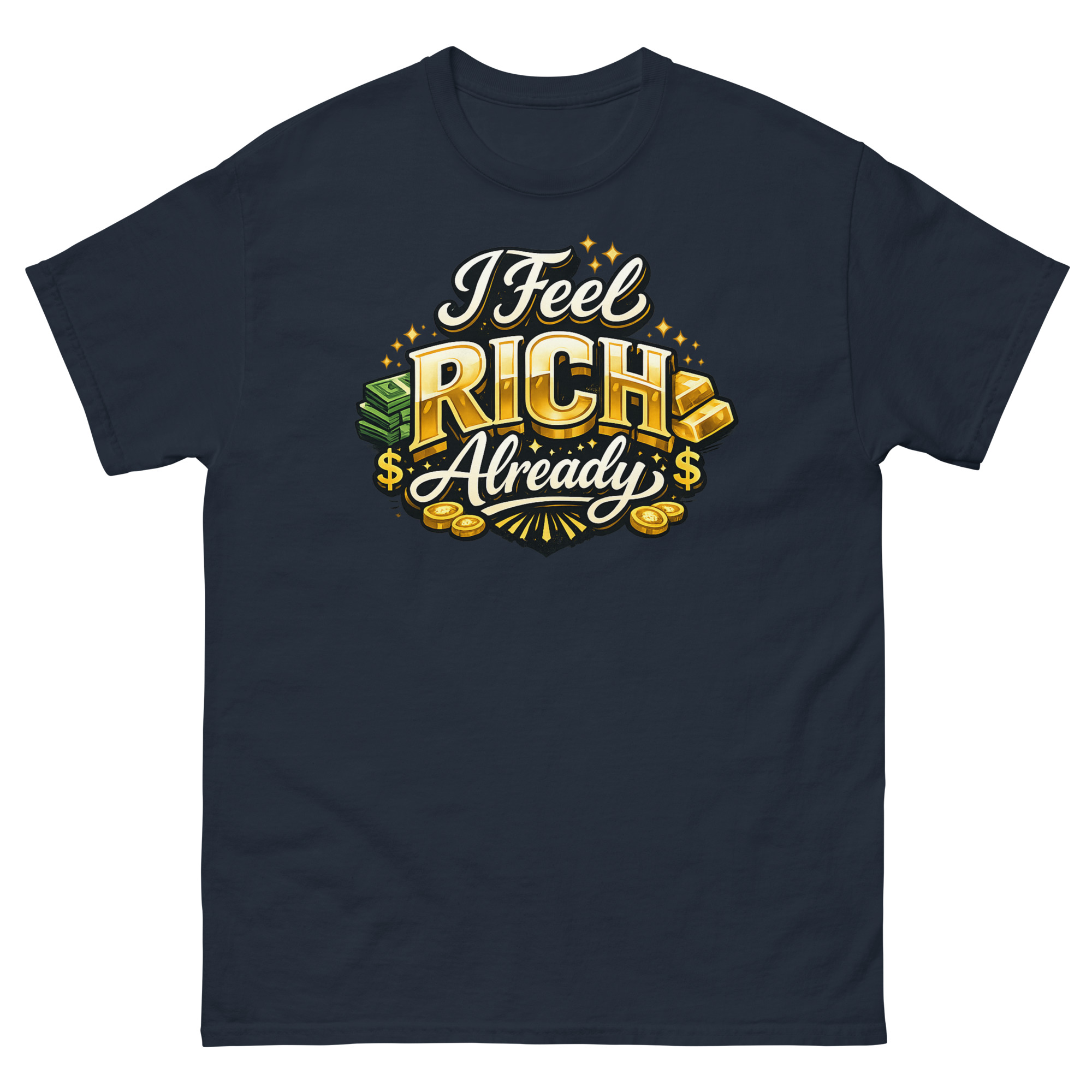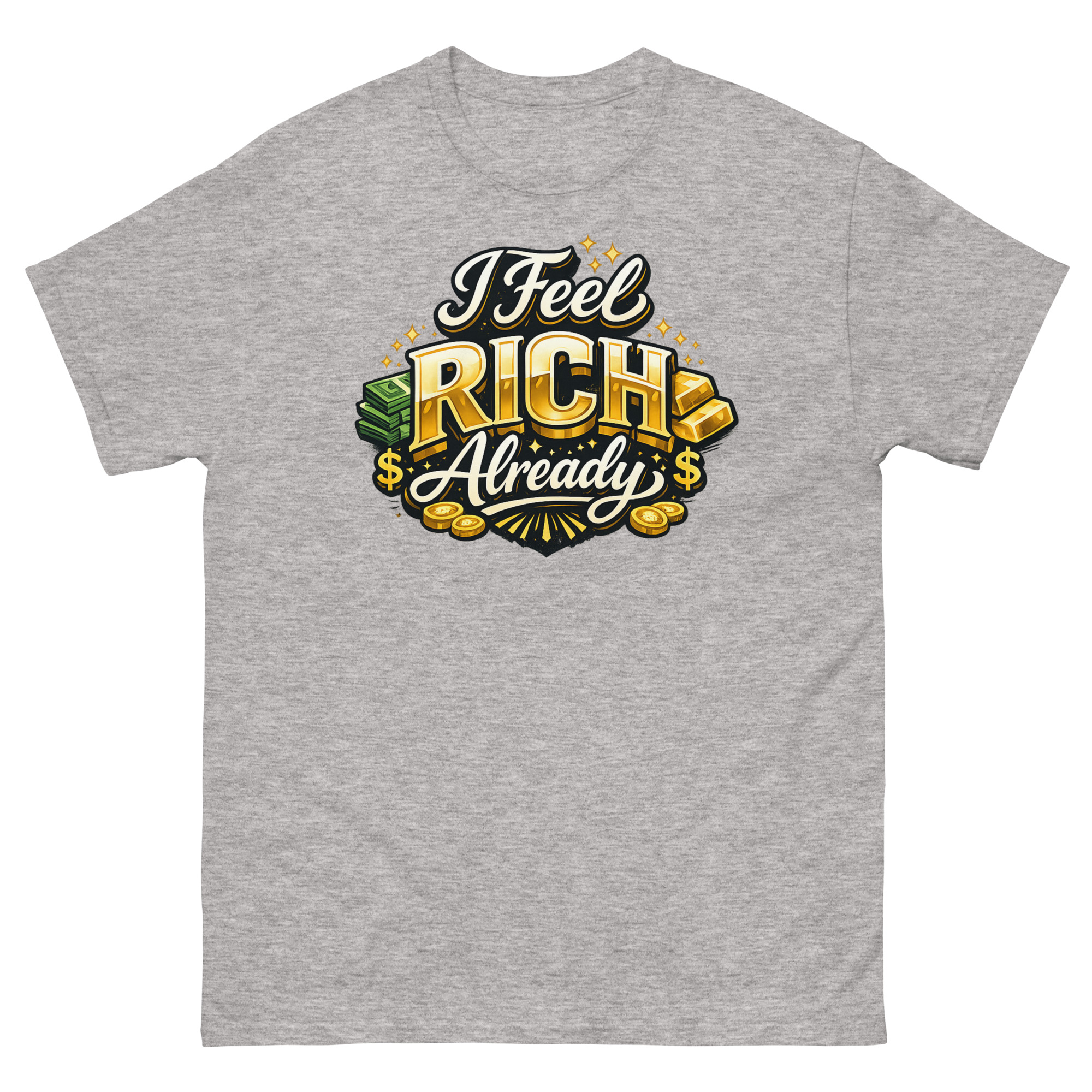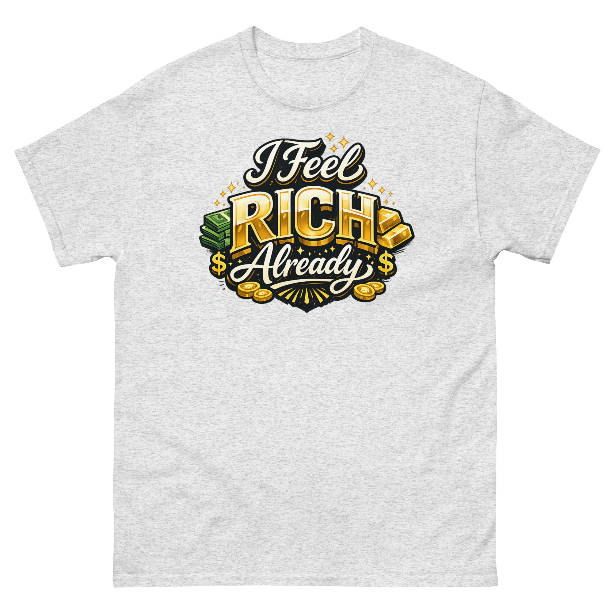 We designed this I Feel Rich Already Shirt for a practical reason: we believe what you wear can influence how you think. Instead of a vague motivational quote, we wanted a design that visually embodied the feeling of wealth. The hyper-realistic gold bars and sparkling coins aren’t just for show; they’re a visual anchor for that “rich” mindset. The idea is simple, wear the feeling to help cultivate it.