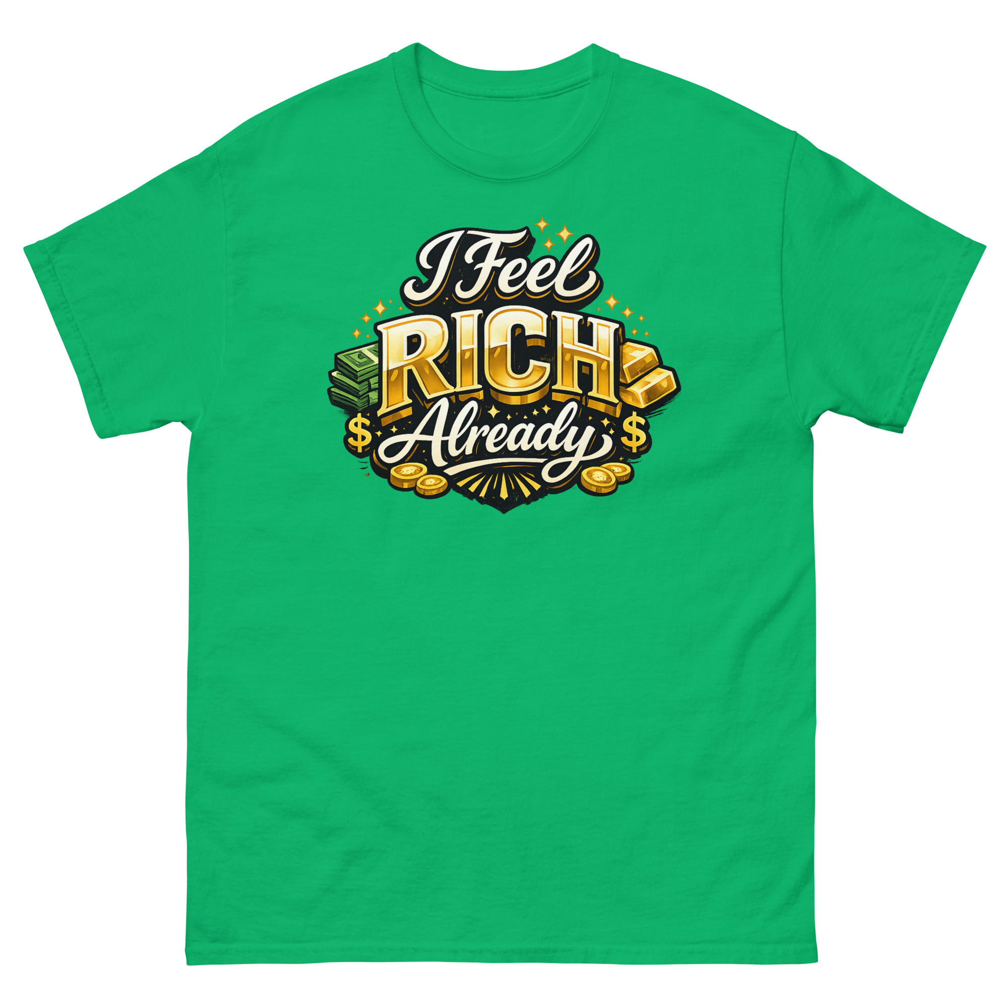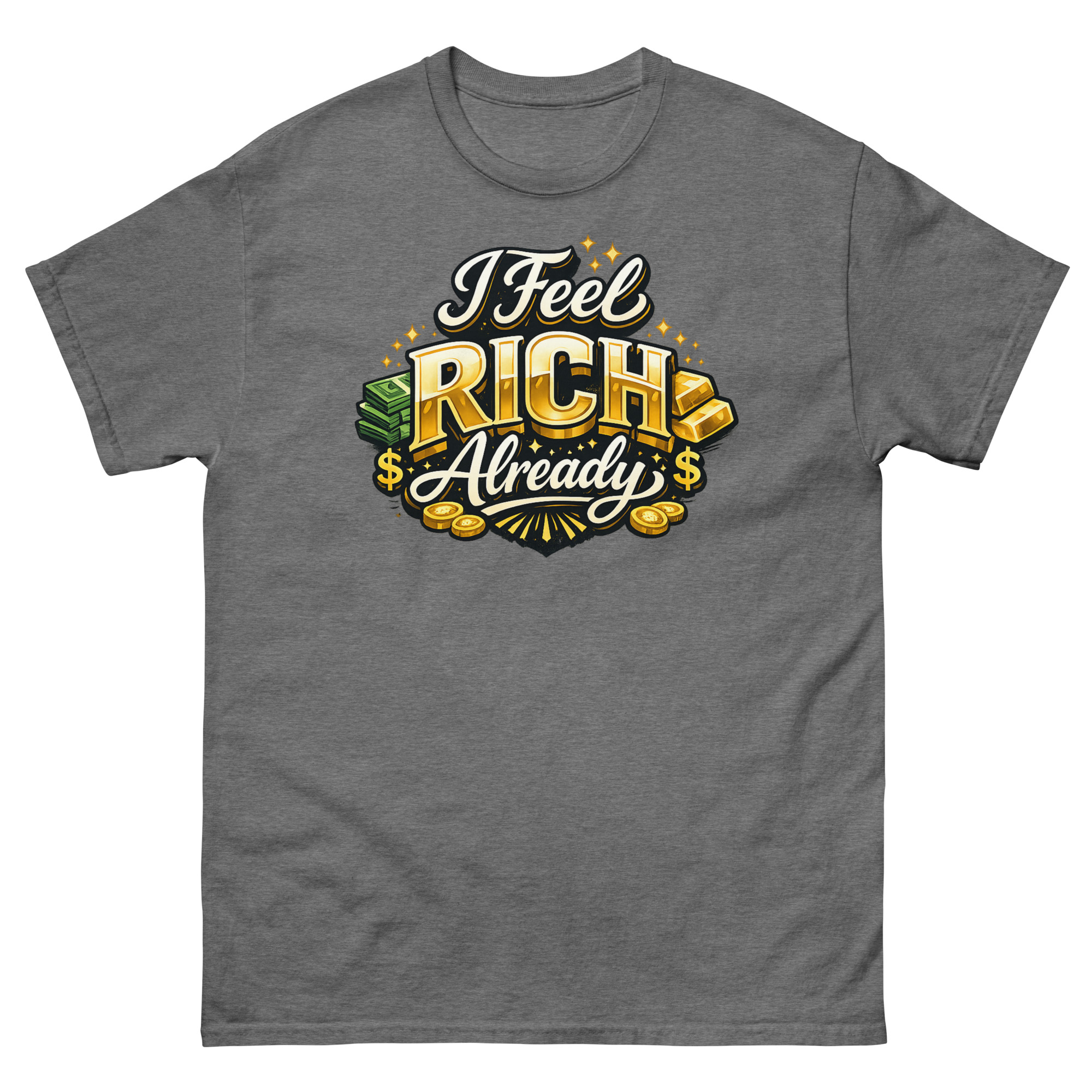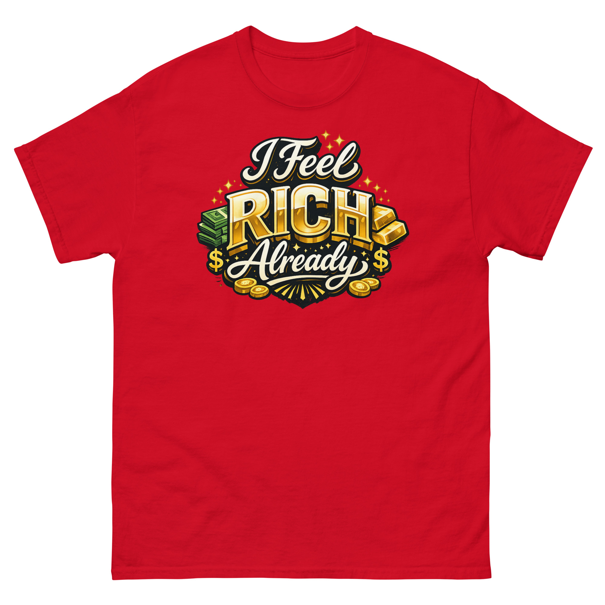 We designed this I Feel Rich Already Shirt for a practical reason: we believe what you wear can influence how you think. Instead of a vague motivational quote, we wanted a design that visually embodied the feeling of wealth. The hyper-realistic gold bars and sparkling coins aren’t just for show; they’re a visual anchor for that “rich” mindset. The idea is simple, wear the feeling to help cultivate it.