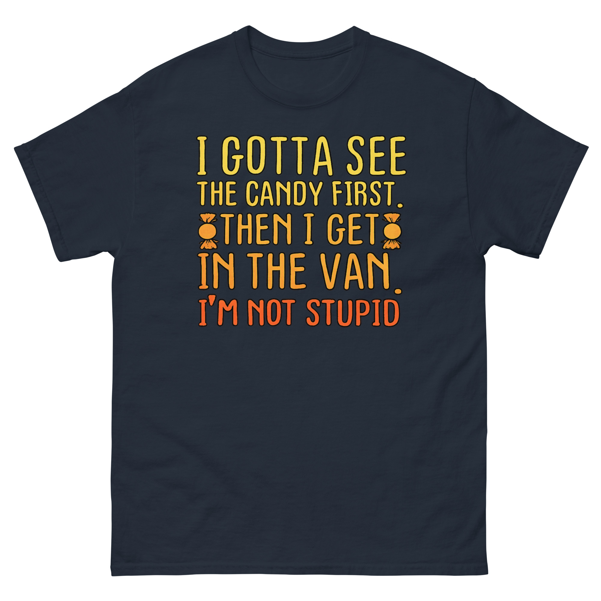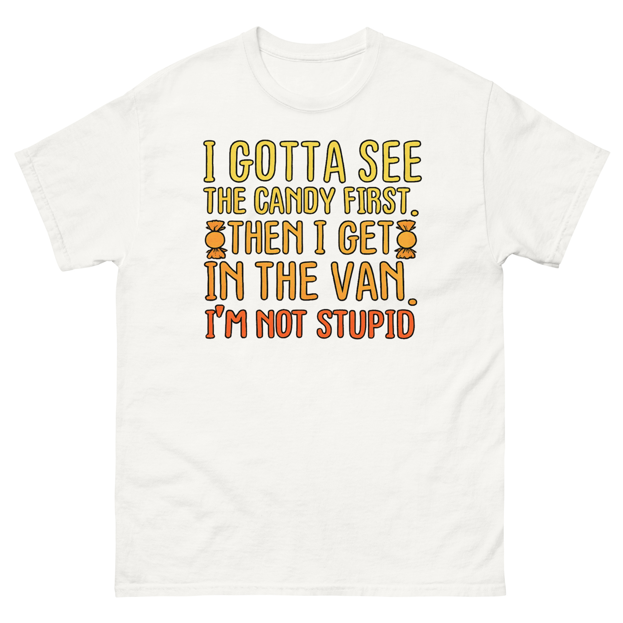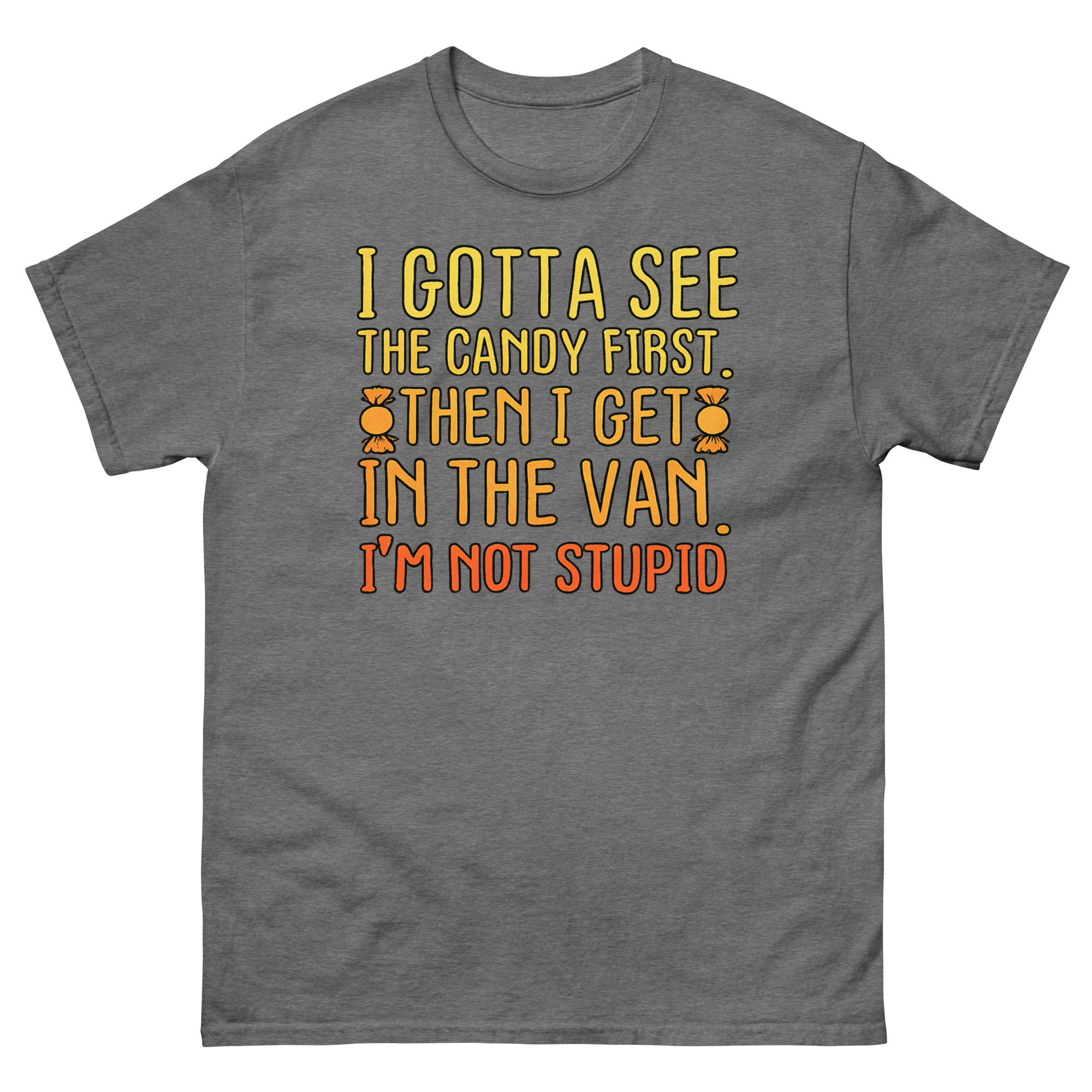 The I Gotta See The Candy First T Shirt is a classic cotton tee featuring a bold, funny phrase in a vibrant sunset gradient. Its unique appeal lies in its darkly satirical take on a well-known cautionary tale, turning it into a joke about savvy negotiation. This shirt is designed for fans of heavy irony and serves as the perfect sarcastic gift for friends with a dark sense of humor.