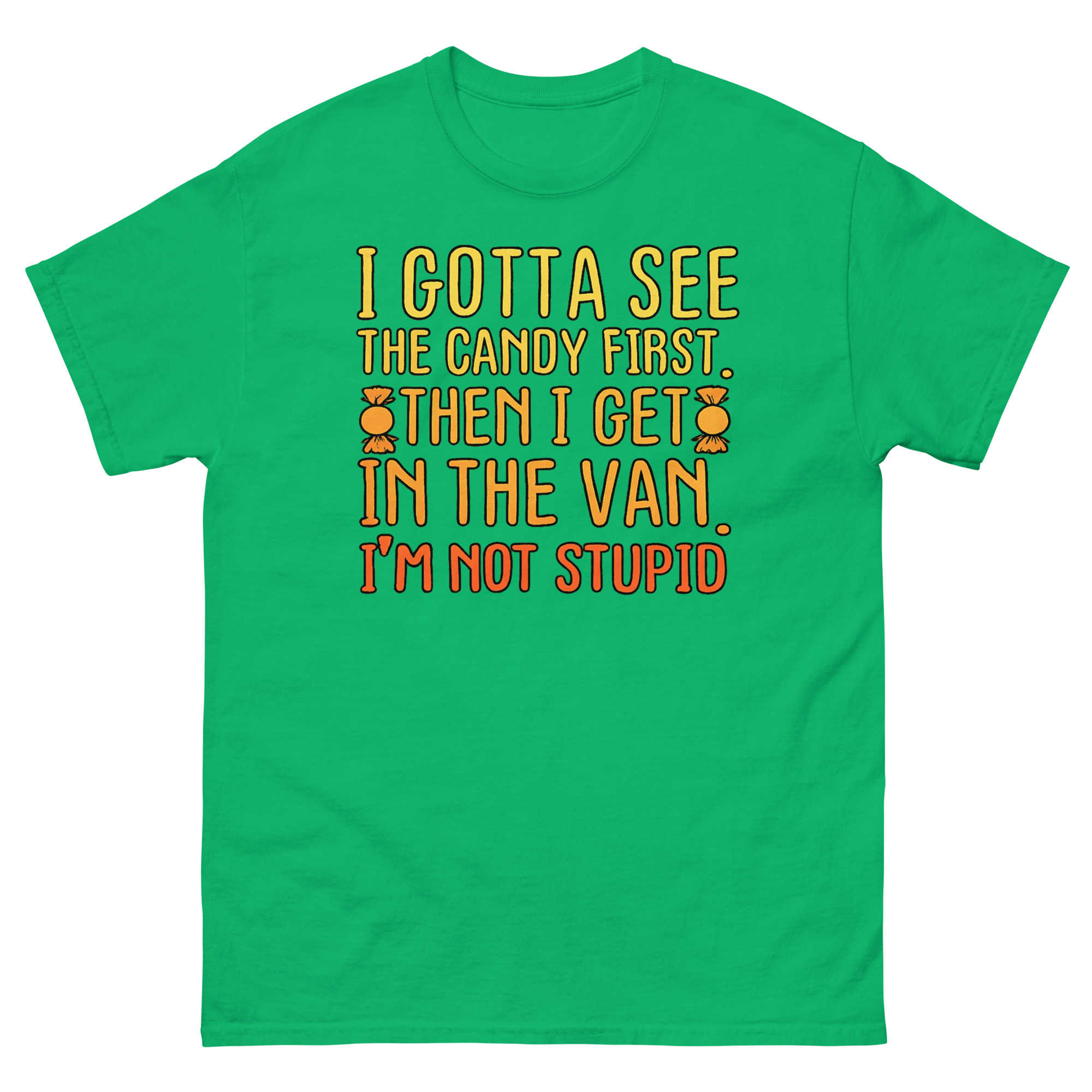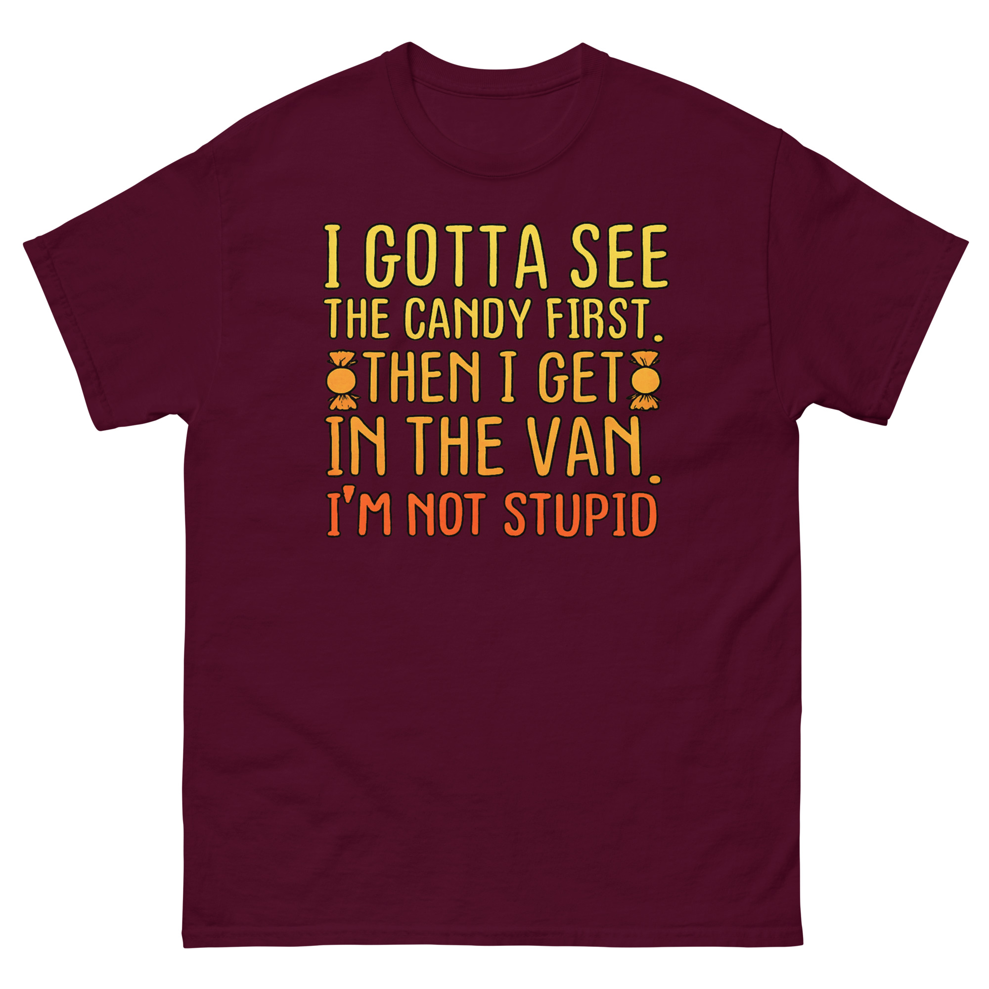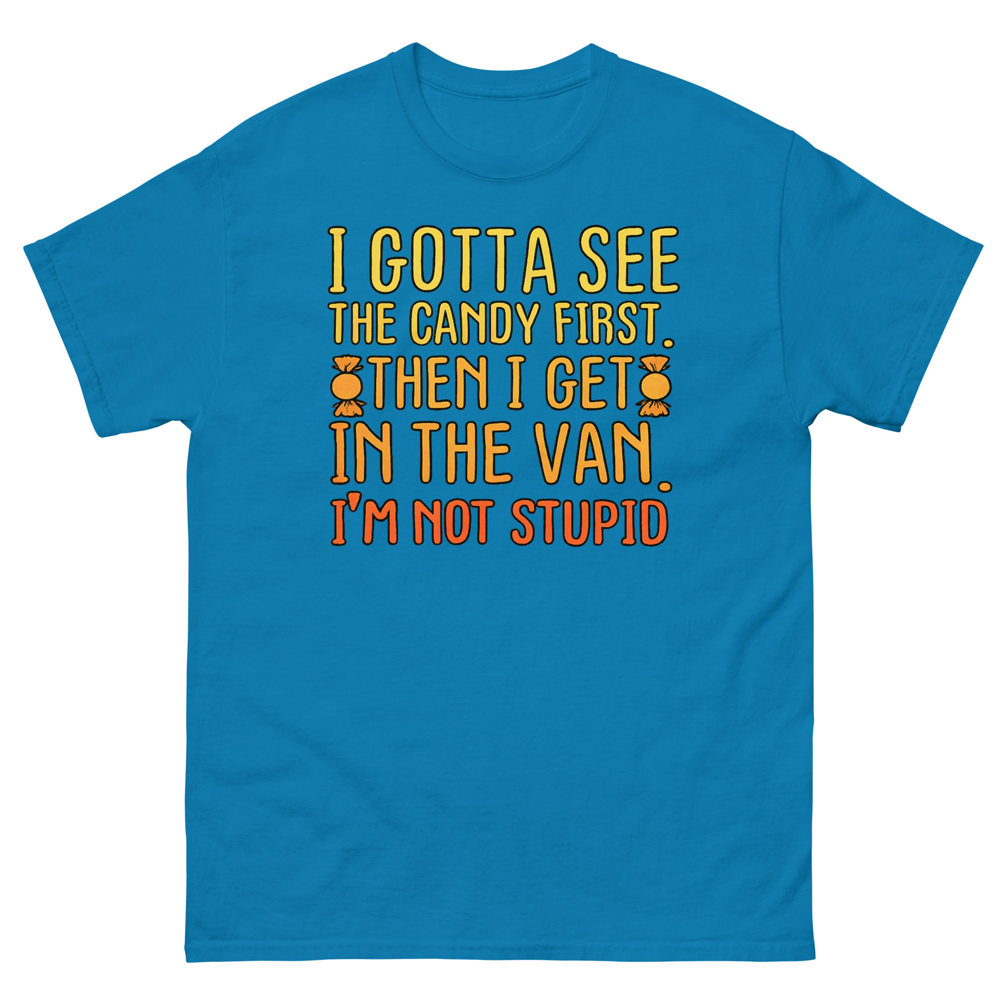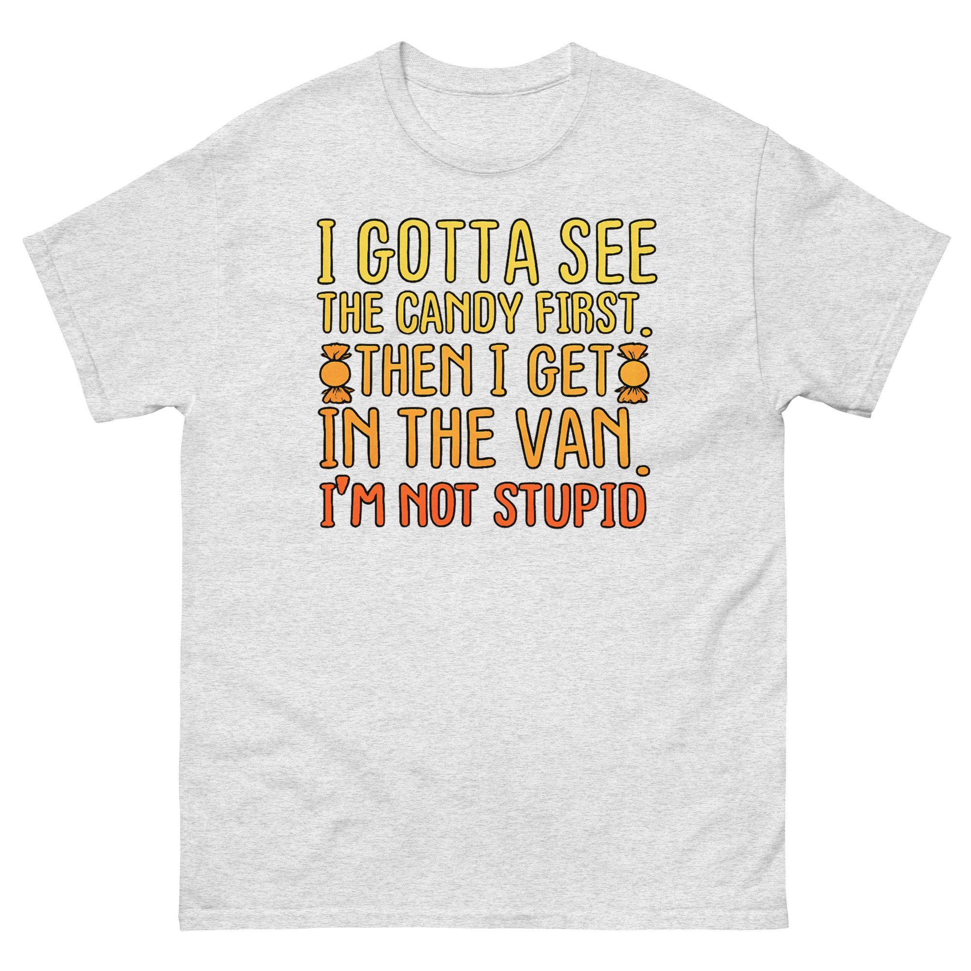 The I Gotta See The Candy First T Shirt is a classic cotton tee featuring a bold, funny phrase in a vibrant sunset gradient. Its unique appeal lies in its darkly satirical take on a well-known cautionary tale, turning it into a joke about savvy negotiation. This shirt is designed for fans of heavy irony and serves as the perfect sarcastic gift for friends with a dark sense of humor.
