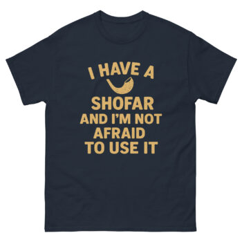 This playful Rosh Hashanah t-shirt features the bold phrase “I Have A Shofar And I’m Not Afraid To Use It” with a simple shofar graphic. Perfect for anyone who loves Jewish humor and wants to celebrate the Jewish New Year with a smile.