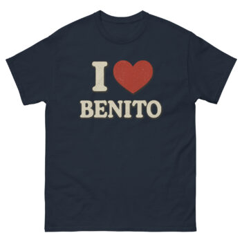 The I Heart Benito T-Shirt blends classic vintage vibes with a personal touch. Designed for anyone who loves someone named Benito (or fans of pop icons like Benito Martínez), this tee is equal parts retro charm and heartfelt statement. The large red heart and bold serif lettering make it a perfect everyday shirt or a thoughtful gift that says love out loud. Whether you’re showing affection for your partner, a friend, or your favorite artist, this shirt captures pure appreciation with timeless style.
