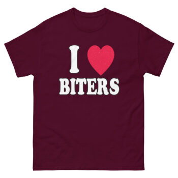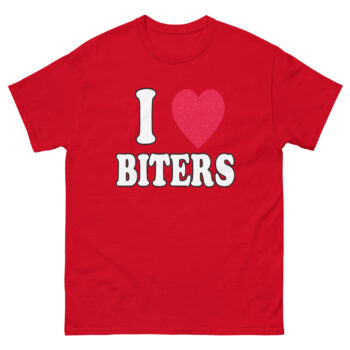Let’s break down the look that gets people talking. First, you see the bold, chunky white letters spelling out “I ❤️ BITERS” across your chest. The font is friendly and rounded, making the message feel approachable rather than aggressive. Meanwhile, the bright red heart adds a pop of color and warmth, creating a fun contrast with the word “BITERS.” This isn’t a scary horror shirt; it’s a lighthearted nod to the things—or creatures—you adore. Consequently, the high-contrast design instantly grabs attention and makes your statement easy to read from across the room.