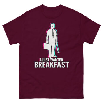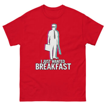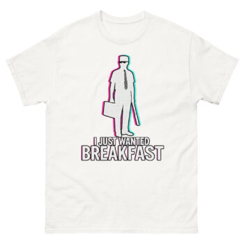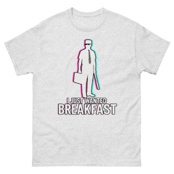 I Just Wanted Breakfast Shirts is a high-quality cotton t-shirt featuring a unique graphic inspired by the 1993 film Falling Down. Unlike a standard logo tee, the design uses a modern glitch-art style to capture a specific, relatable moment of frustration we’ve all felt. It’s crafted for fans of classic cinema, cynical humor, and comfortable streetwear that makes a statement. Ultimately, this i just wanted breakfast shirt is a perfect, conversation-starting piece for anyone whose sense of humor leans towards the gloriously grumpy.