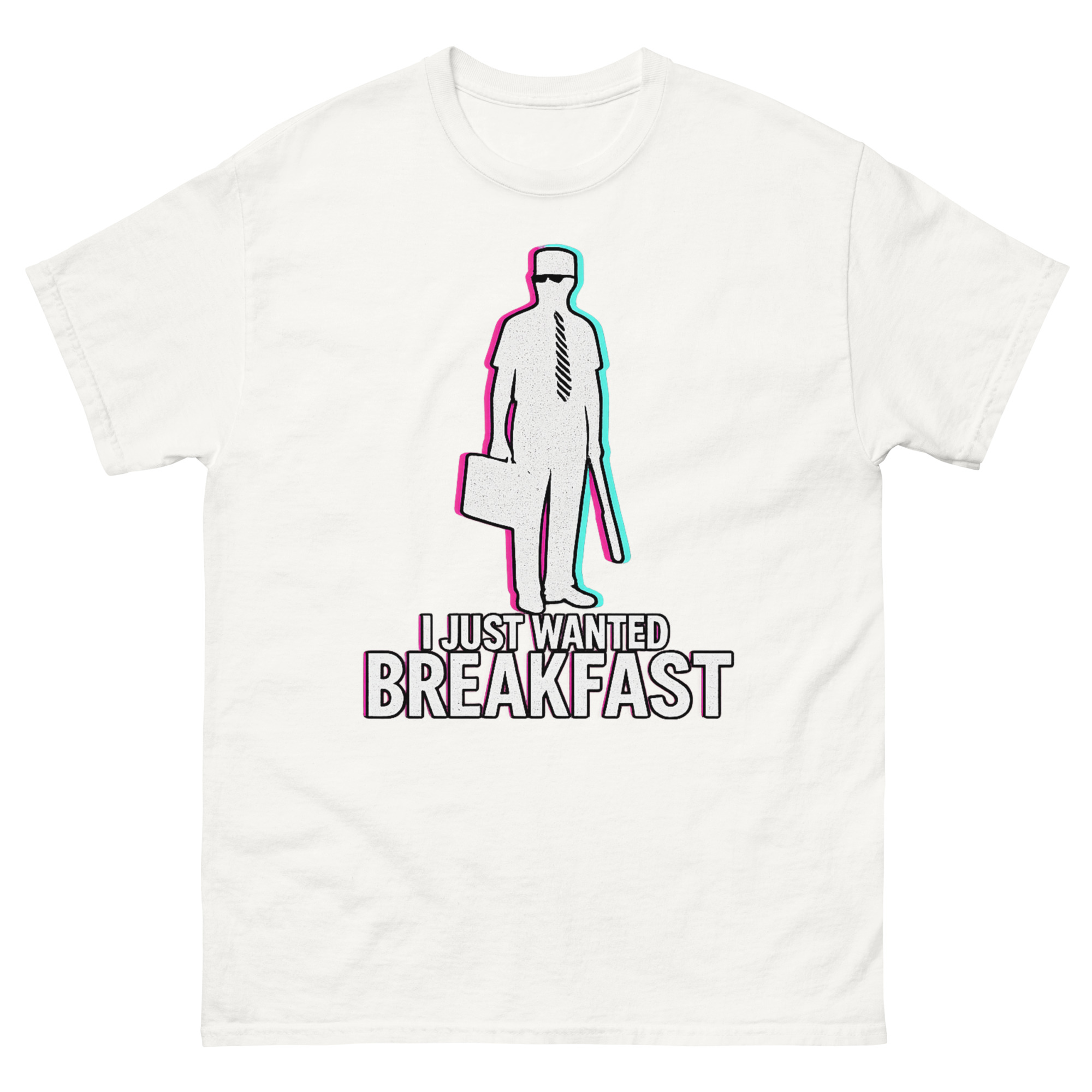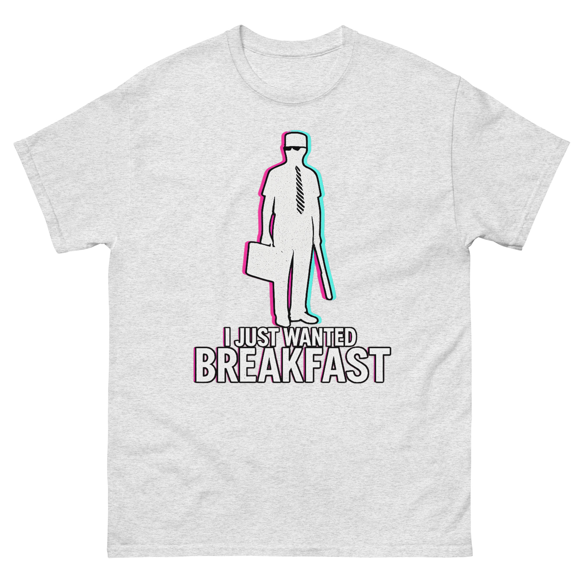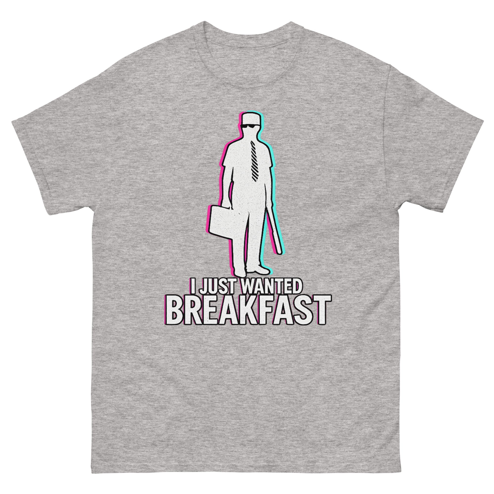 Consequently, we didn’t just reprint a movie poster. Instead, we reimagined the iconic silhouette William Foster with a contemporary vaporwave aesthetic. Using chromatic aberration effects, the image has a vibrating, slightly glitched-out feel. This visual choice represents that precise moment when your patience finally snaps. It’s a I Just Wanted Breakfast Shirt design that resonates with movie buffs, appeals to those with a darkly comic view of modern life, and stands out as a unique piece of wearable art.