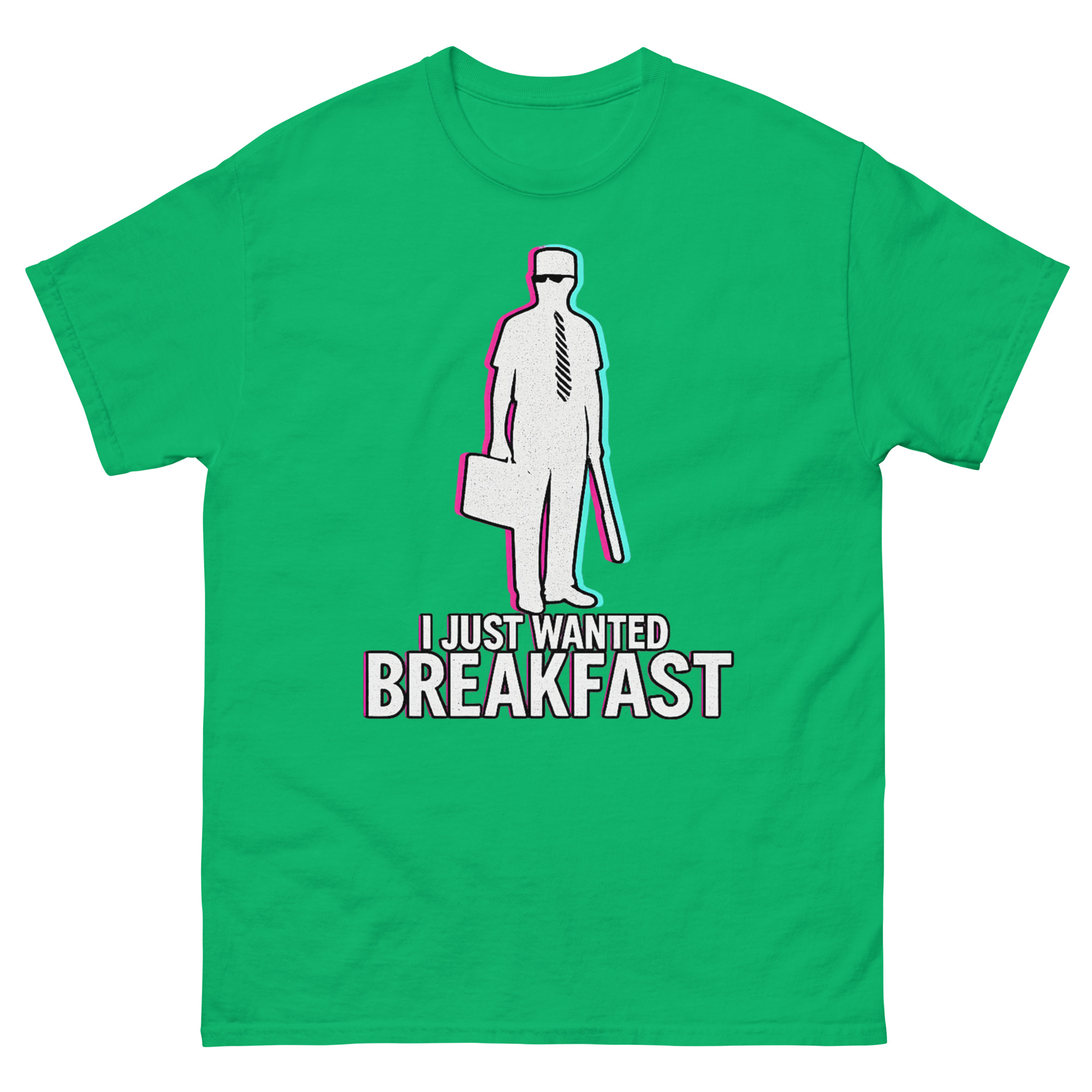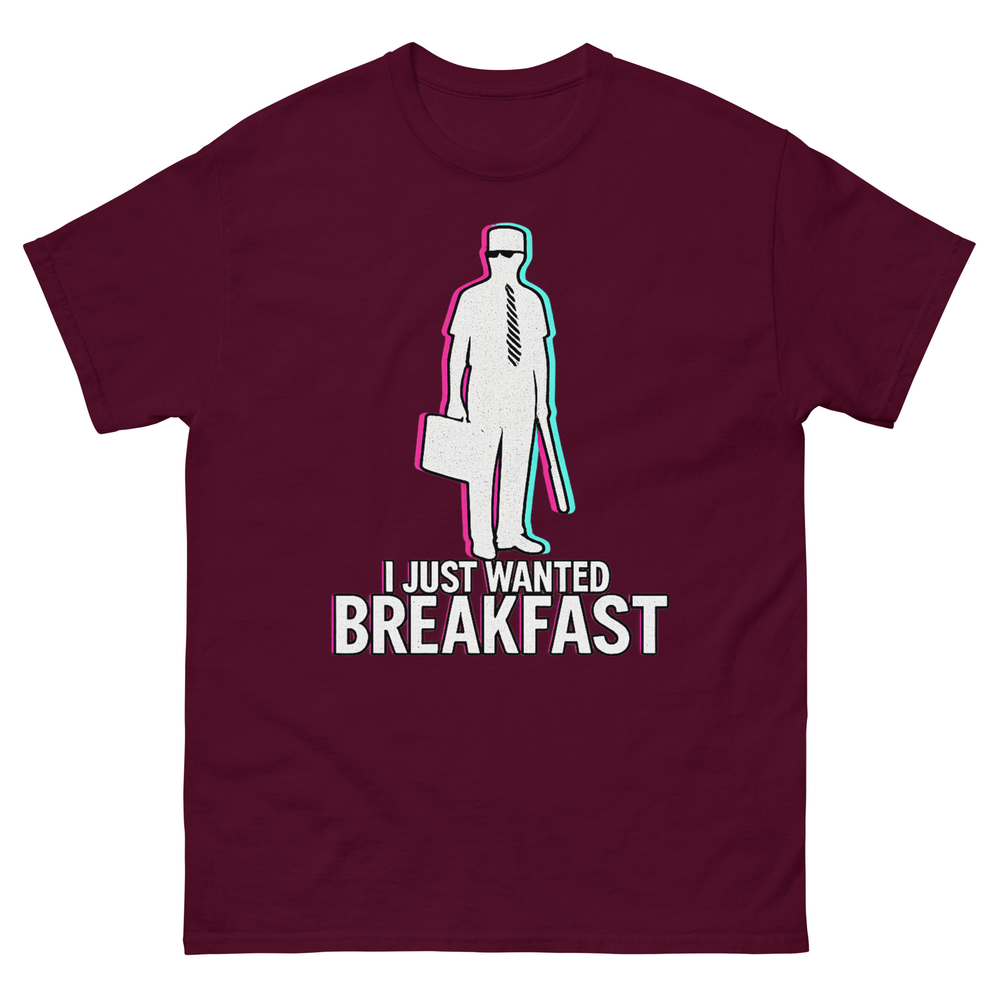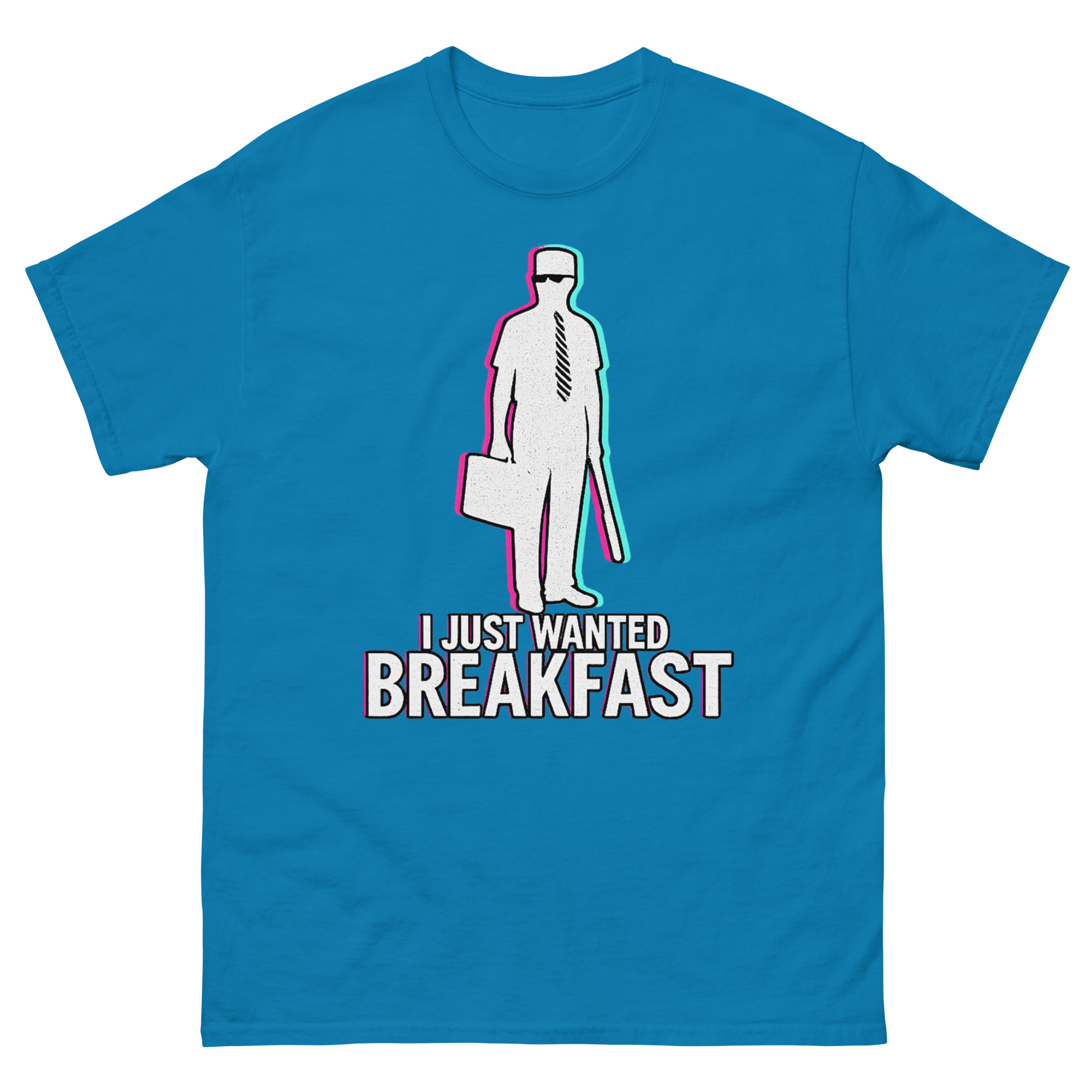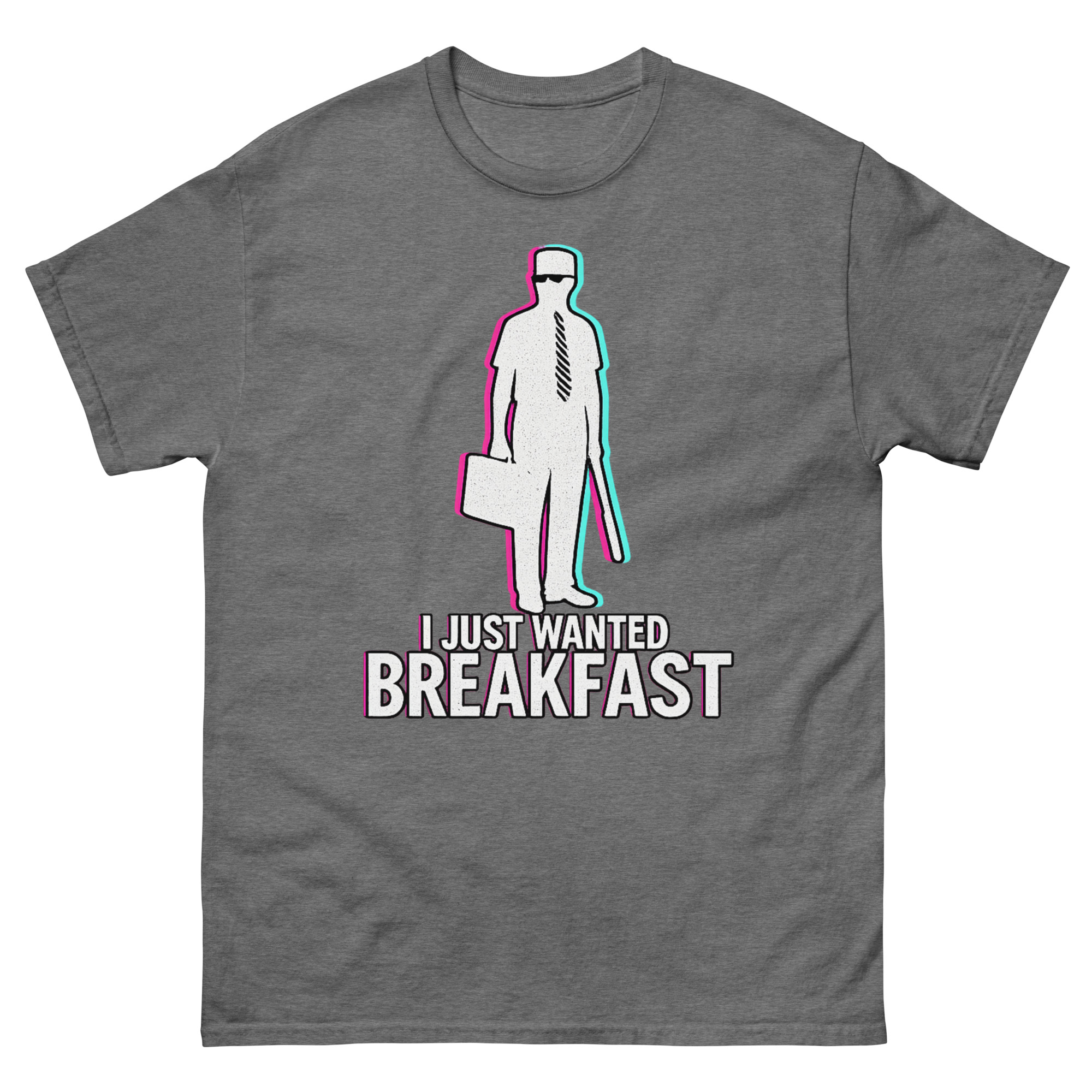 Consequently, we didn’t just reprint a movie poster. Instead, we reimagined the iconic silhouette William Foster with a contemporary vaporwave aesthetic. Using chromatic aberration effects, the image has a vibrating, slightly glitched-out feel. This visual choice represents that precise moment when your patience finally snaps. It’s a I Just Wanted Breakfast Shirt design that resonates with movie buffs, appeals to those with a darkly comic view of modern life, and stands out as a unique piece of wearable art.