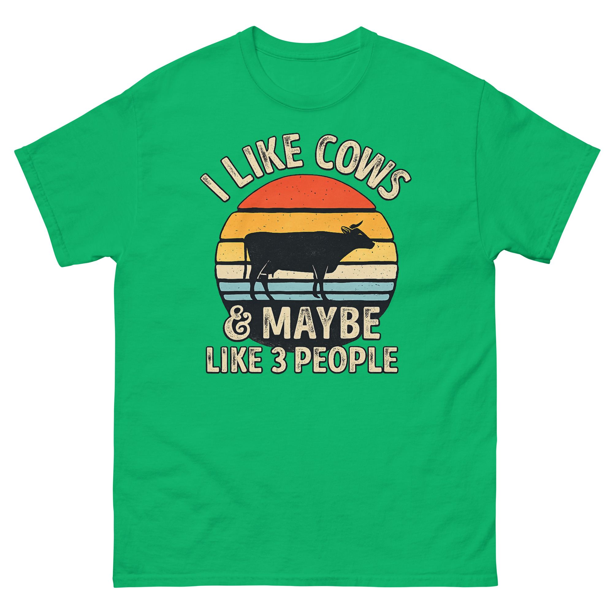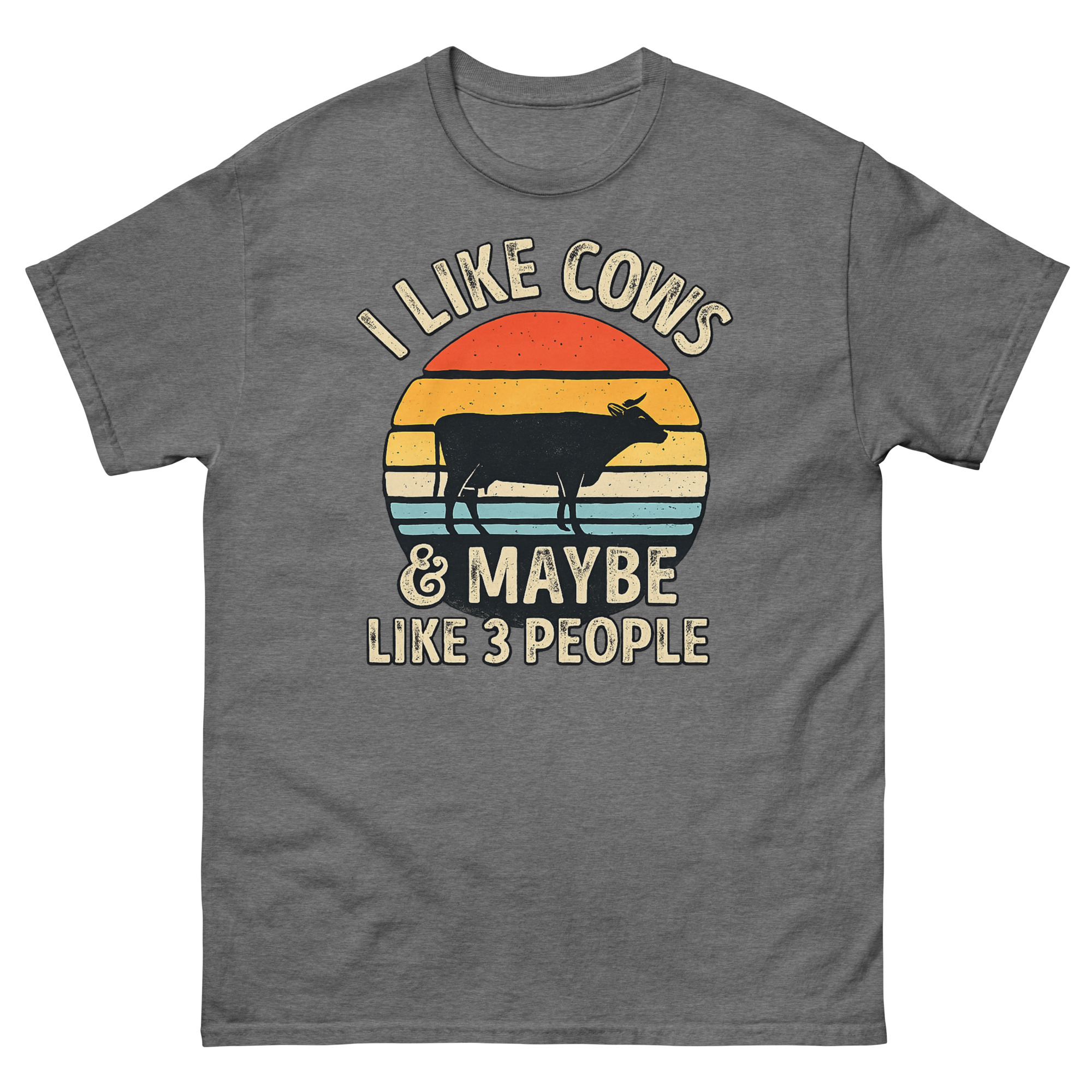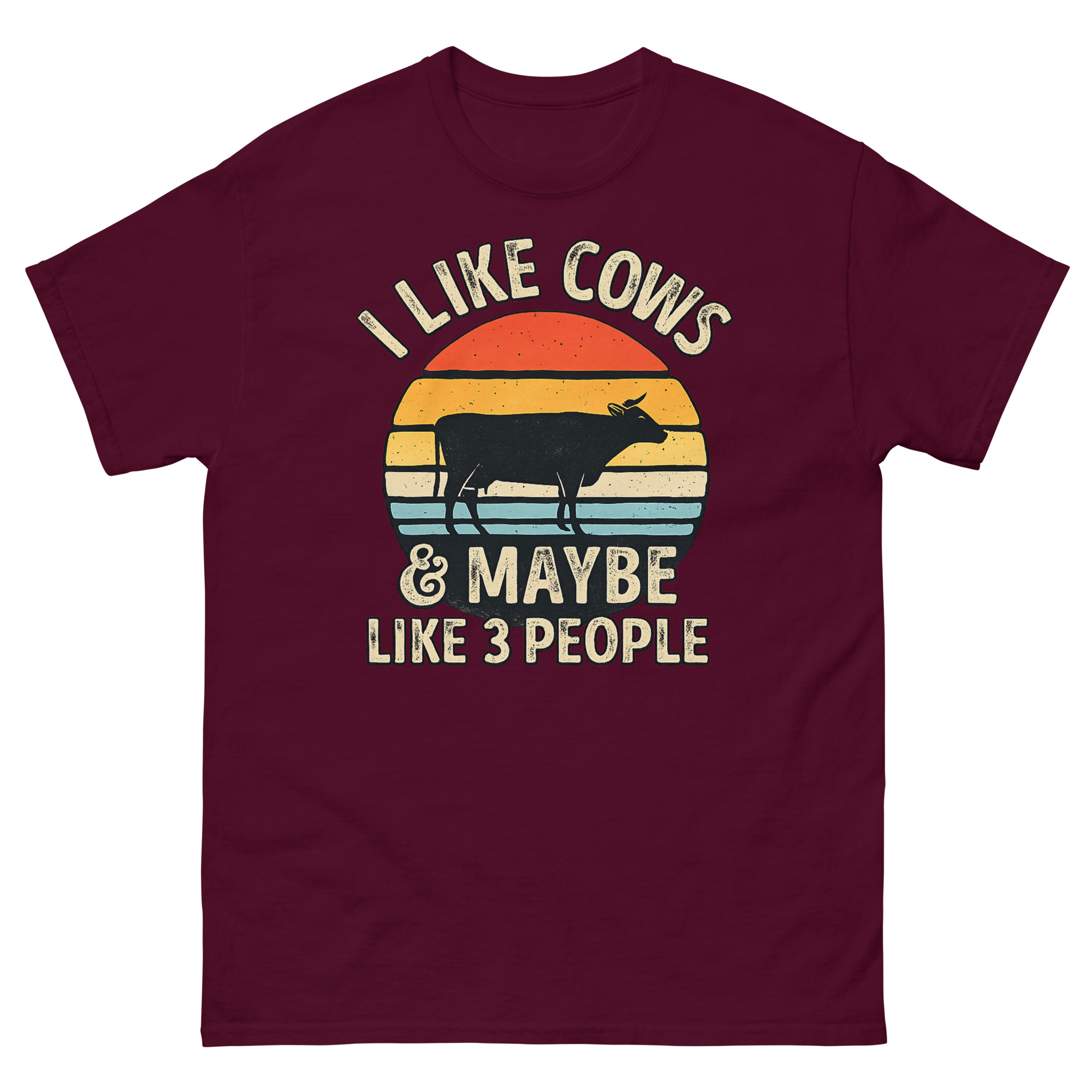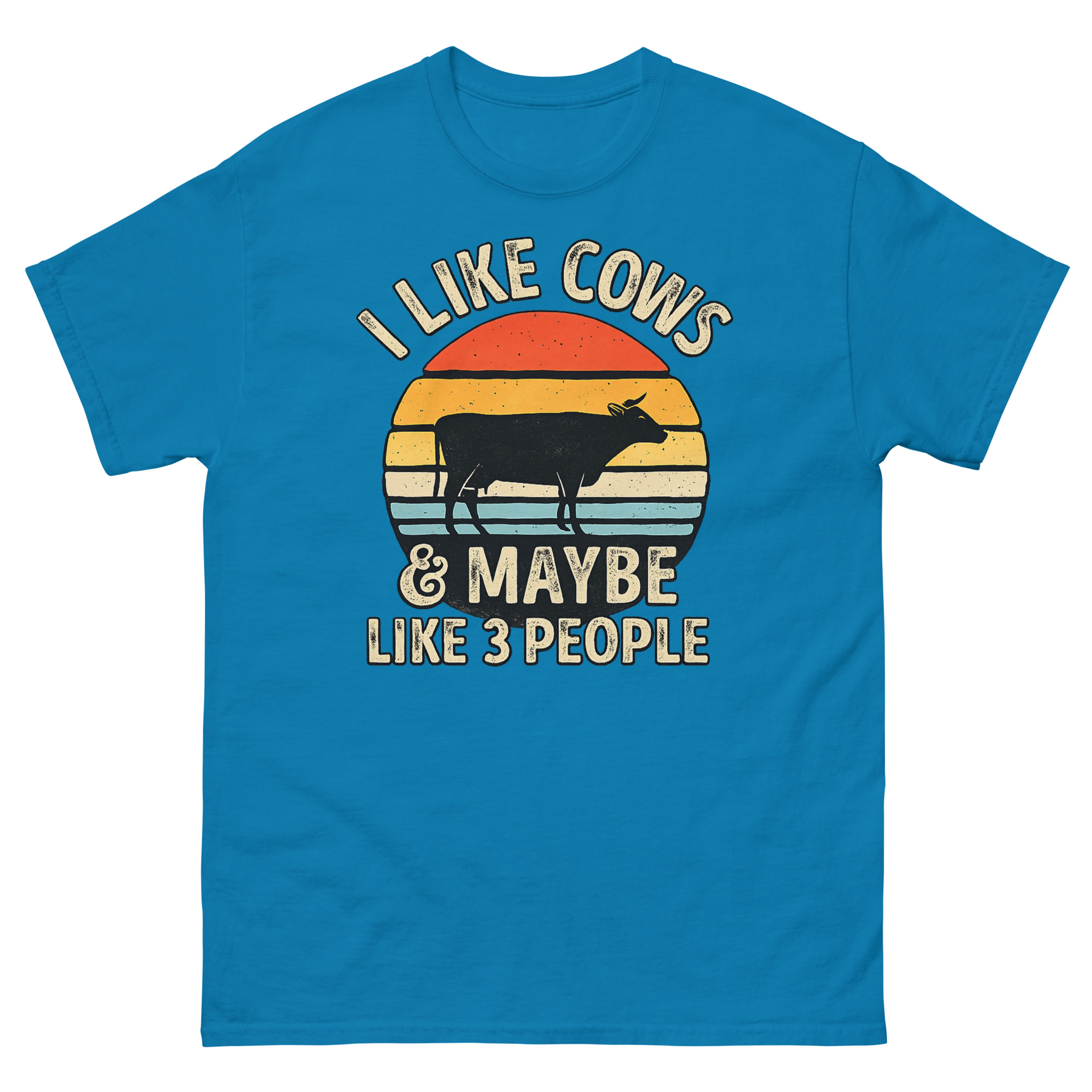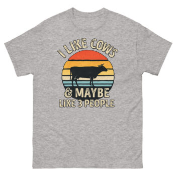 This is a comfortable cotton t-shirt featuring a vintage graphic that makes a humorous and honest statement. The I Like Cows and Maybe Like 3 People shirt stands out with its unique blend of retro sunset art and a witty message. It’s made for genuine animal lovers, farmers, and rural introverts who value a quiet life with their herd more than a busy social calendar.