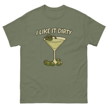 Not at all! The humor is playful and cheeky, not crude. The phrase “I like it dirty” is a well-known and lighthearted double entendre in the cocktail world, primarily referring to the olive brine in a dirty martini. It’s designed to be a funny, clever drink pun t-shirt for adults.