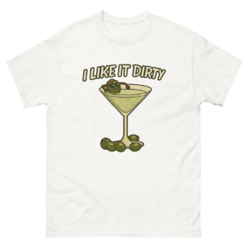 The Punchline: Above the glass, the phrase “I LIKE IT DIRTY” is printed in bold, modern letters. This is the double entendre that makes this drink pun t-shirt so much fun. It directly refers to the olive brine in a dirty martini, but it also carries a playful, flirtatious wink.