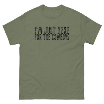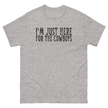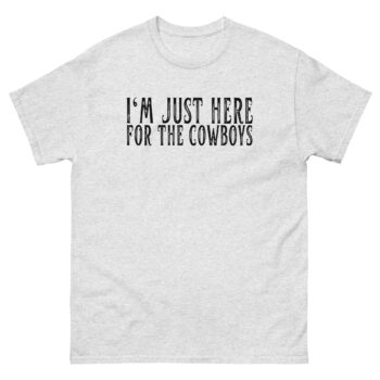 The design gets straight to the point with a cheeky grin. “I’M JUST HERE FOR THE COWBOYS” is printed in a bold, easy-to-read font, with a rustic, western-style lettering for the key word “COWBOYS.”
