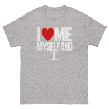 The design is beautifully straightforward, yet its message is incredibly powerful. “I ❤️ ME MYSELF AND I” is printed in a bold, slightly distressed font that gives it a cool, timeless feel.