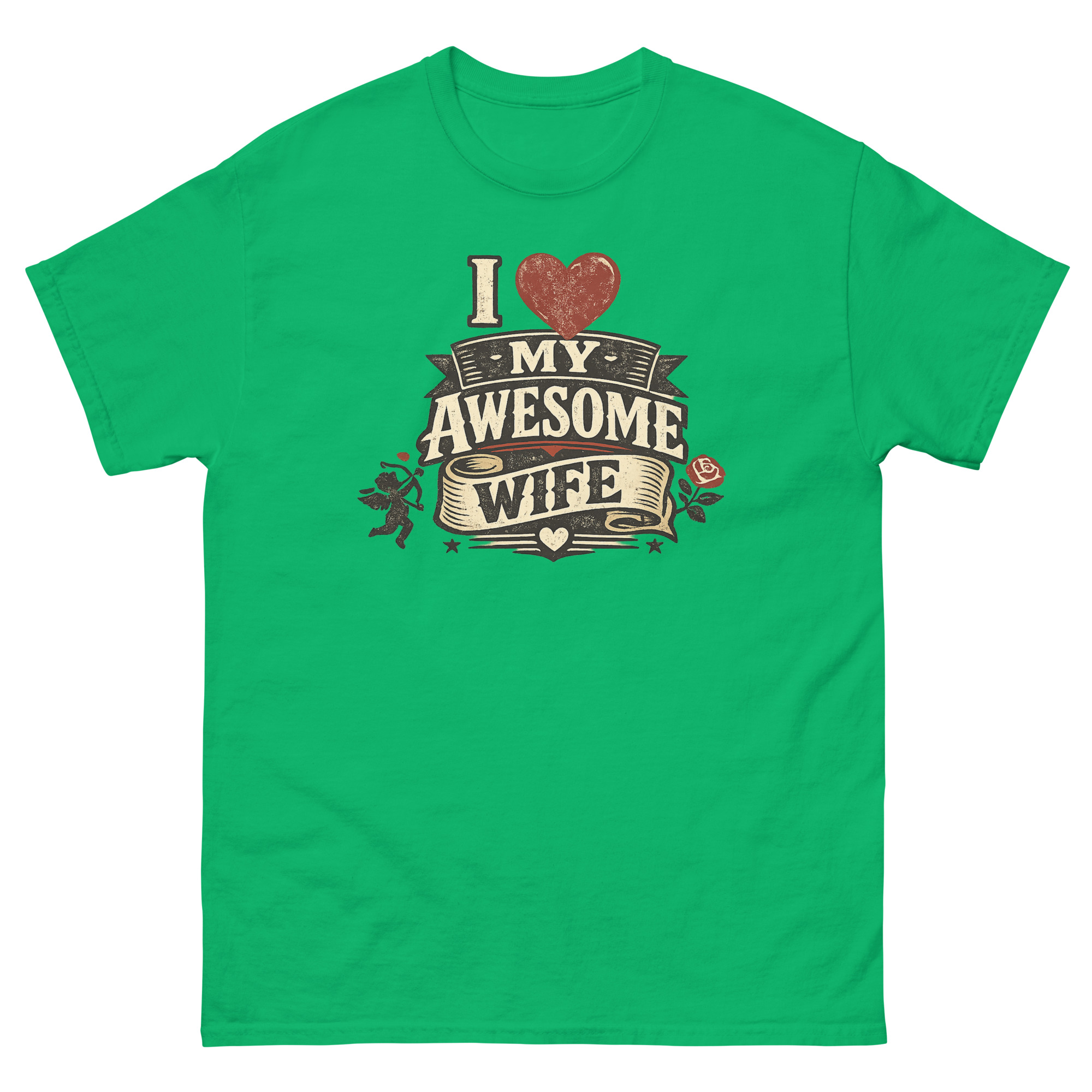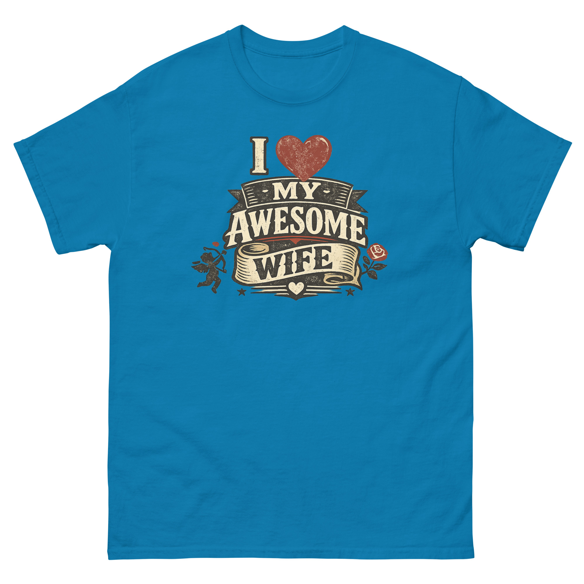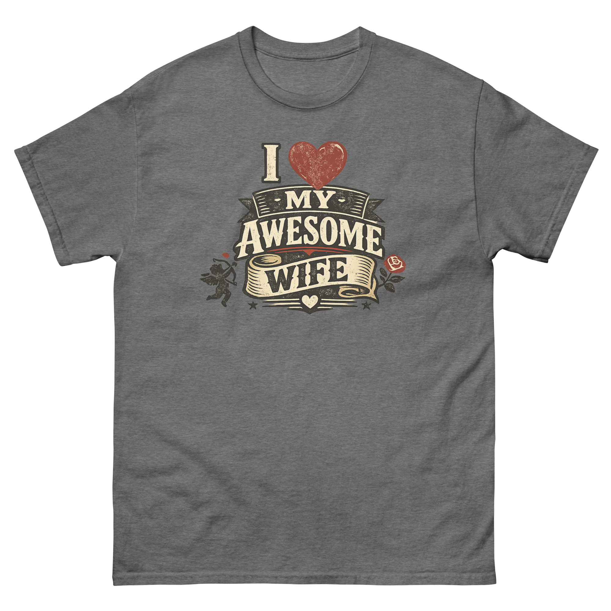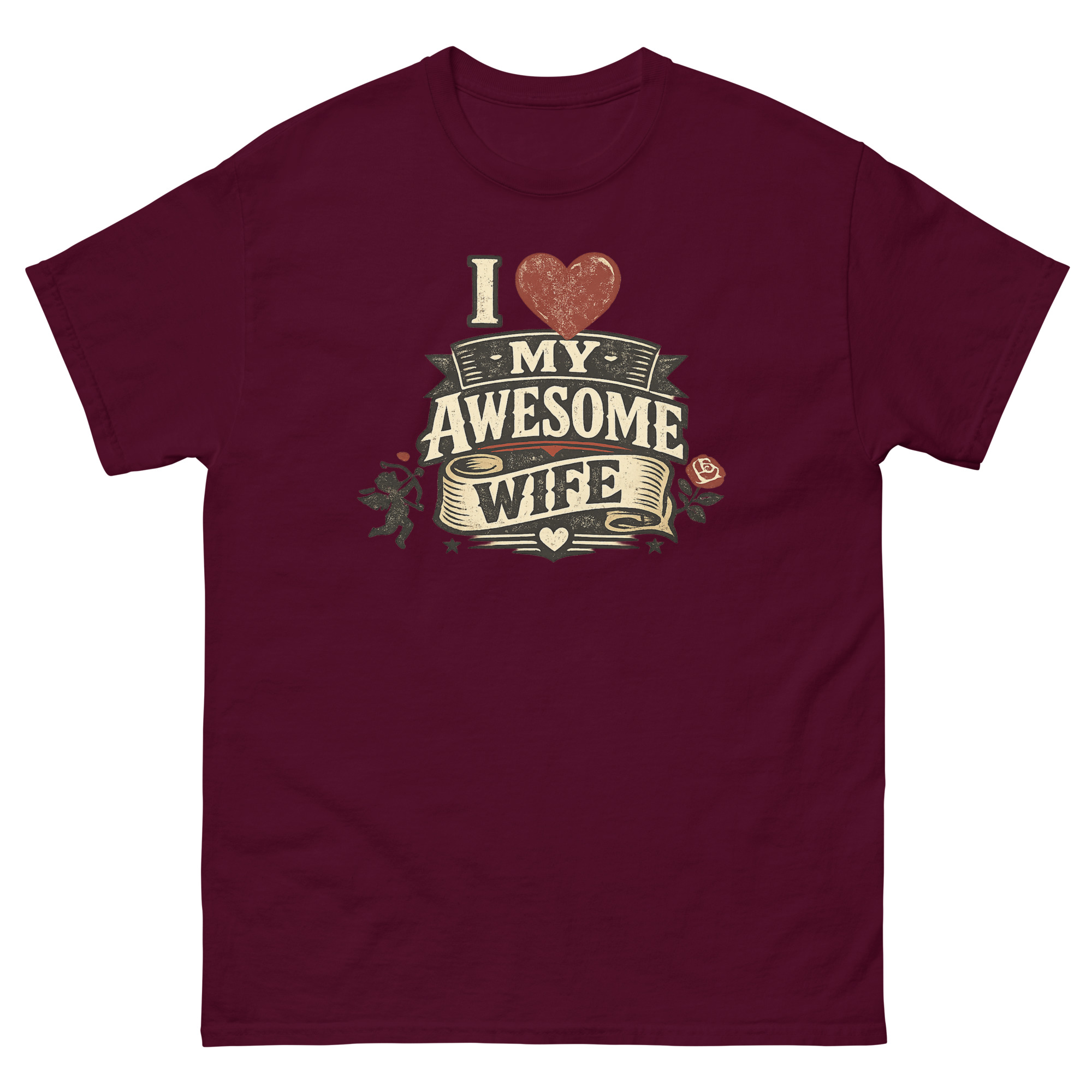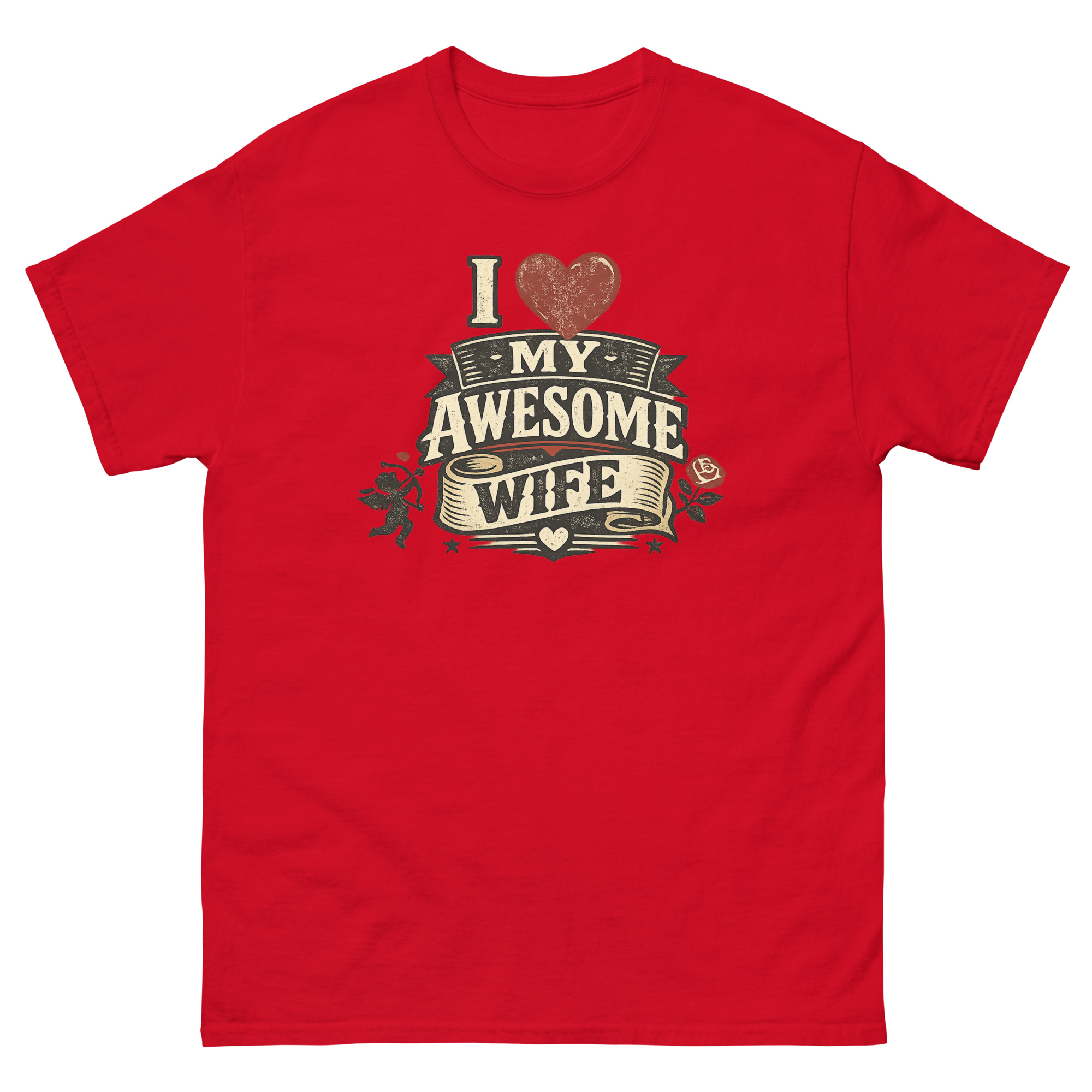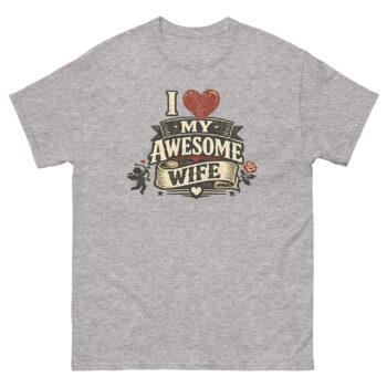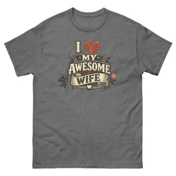 Therefore, we designed a detailed heraldic graphic. The distressed, “cracked ink” effect gives it the feel of a well-loved tavern sign or an antique medal. Symbols of timeless romance, a poised Cupid and a lush red rose, frame the central message. As a result, the “I Love My Awesome Wife” text isn’t just printed; it’s presented on layered banners and a flowing scroll. This approach transforms the shirt from casual wear into a unique piece of marriage celebration clothing for husbands. It’s a natural choice for a romantic birthday gift or an anniversary surprise that feels both personal and powerfully visual.