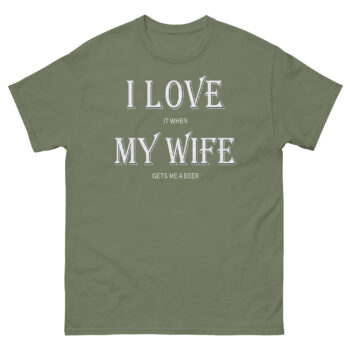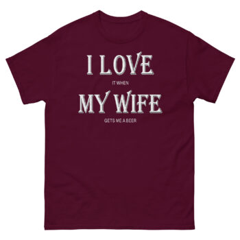 The design hits you with a wave of relatable humor. In bold, eye-catching text, it declares: “I LOVE IT WHEN MY WIFE GETS ME A BEER.” But this isn’t just a joke about beer; it’s a celebration of partnership.