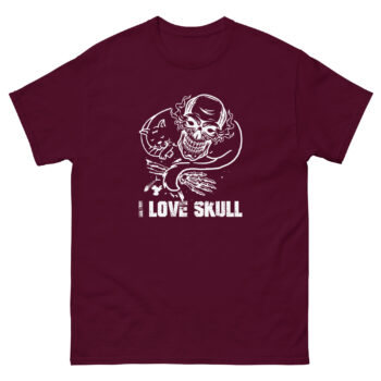 Celebrate your love for all things spooky and feline with this “I Love Skull” t-shirt. Featuring a playful skeleton embracing a cat, it’s the perfect blend of creepy and cute for Halloween, goth vibes, or dark humor lovers.