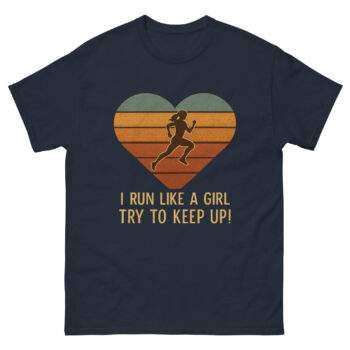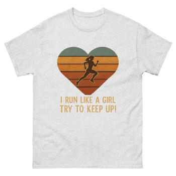 The bold “I RUN LIKE A GIRL” text flips the script on an old insult, transforming it into a badge of honor. Paired with the dynamic runner graphic, this women’s marathon shirt is equal parts stylish and meaningful.