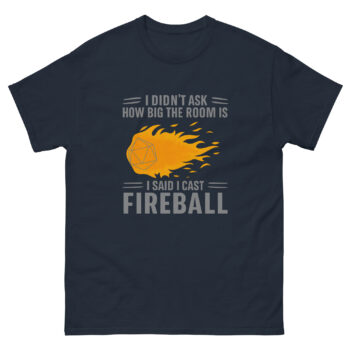 The magic, however, is in the words. At the top, bold letters declare: “I DIDN’T ASK HOW BIG THE ROOM IS.” Then, below the fireball, comes the unforgettable punchline: “I SAID I CAST FIREBALL.” This clever typography isn’t just text; it’s a story in two lines. Therefore, it’s the perfect funny gift for a Dungeon Master who has seen it all, or for the player who lives for cinematic chaos.