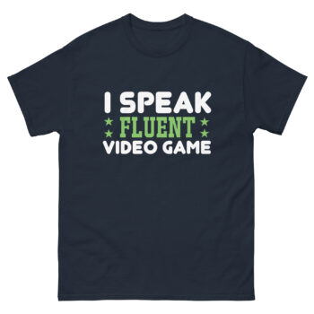 The phrase “I SPEAK FLUENT VIDEO GAME” isn’t just a joke—it’s a badge of honor. The green-highlighted “FLUENT” and star accents give it that extra XP, while the crisp white text keeps it clean. It’s the perfect esports humor apparel for anyone who’s ever: