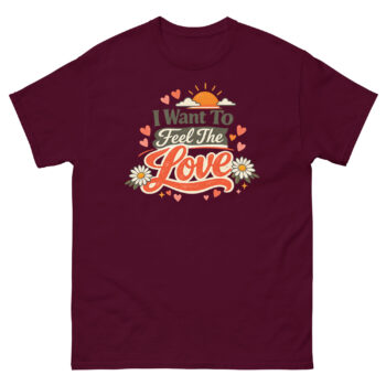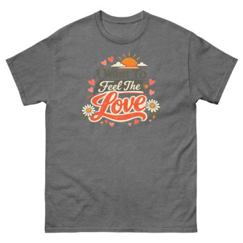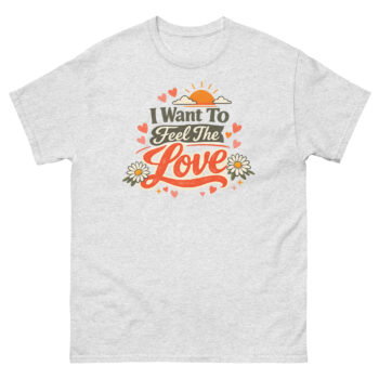 The I Want To Feel The Love T Shirt is a soft, vintage-style tee featuring a warm, retro graphic. It stands out with its unique 1970s-inspired colors and typography, perfect for expressing a positive, hopeful mood. This shirt is designed for anyone who loves classic style and wants comfortable, meaningful positive affirmation streetwear.