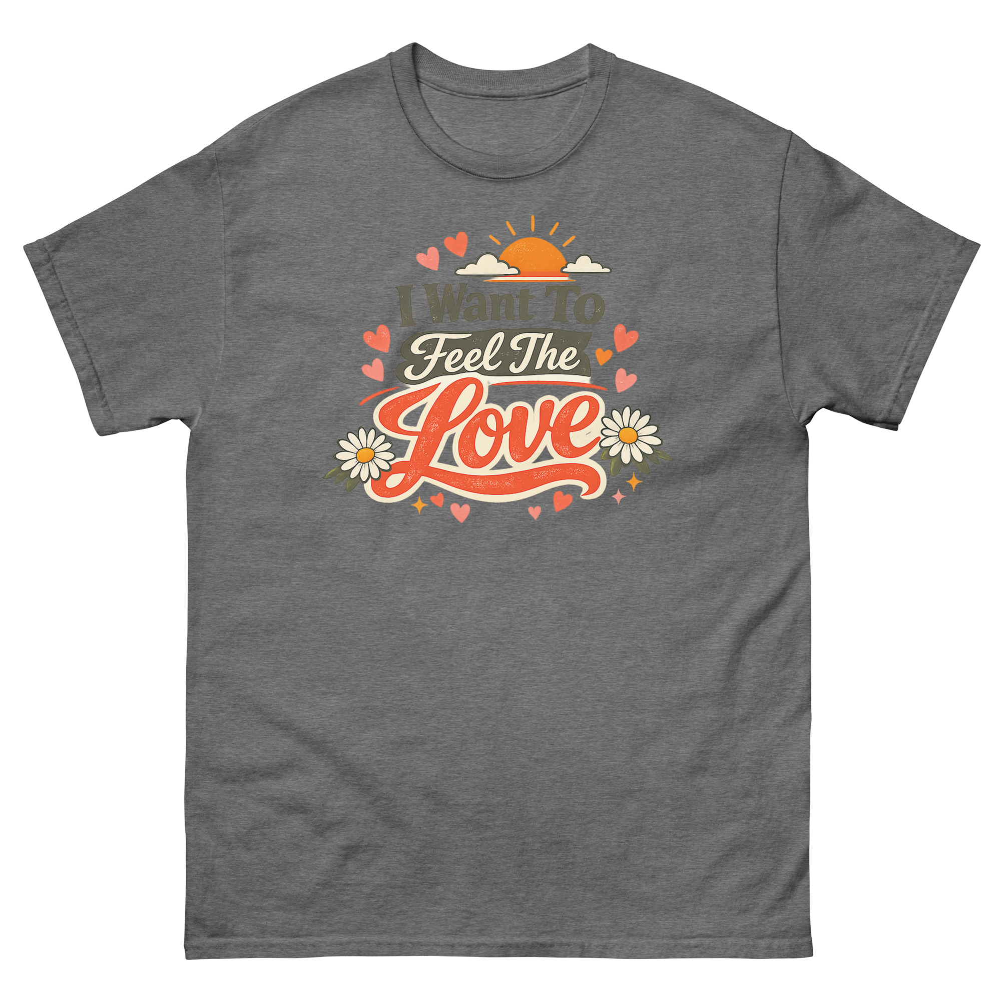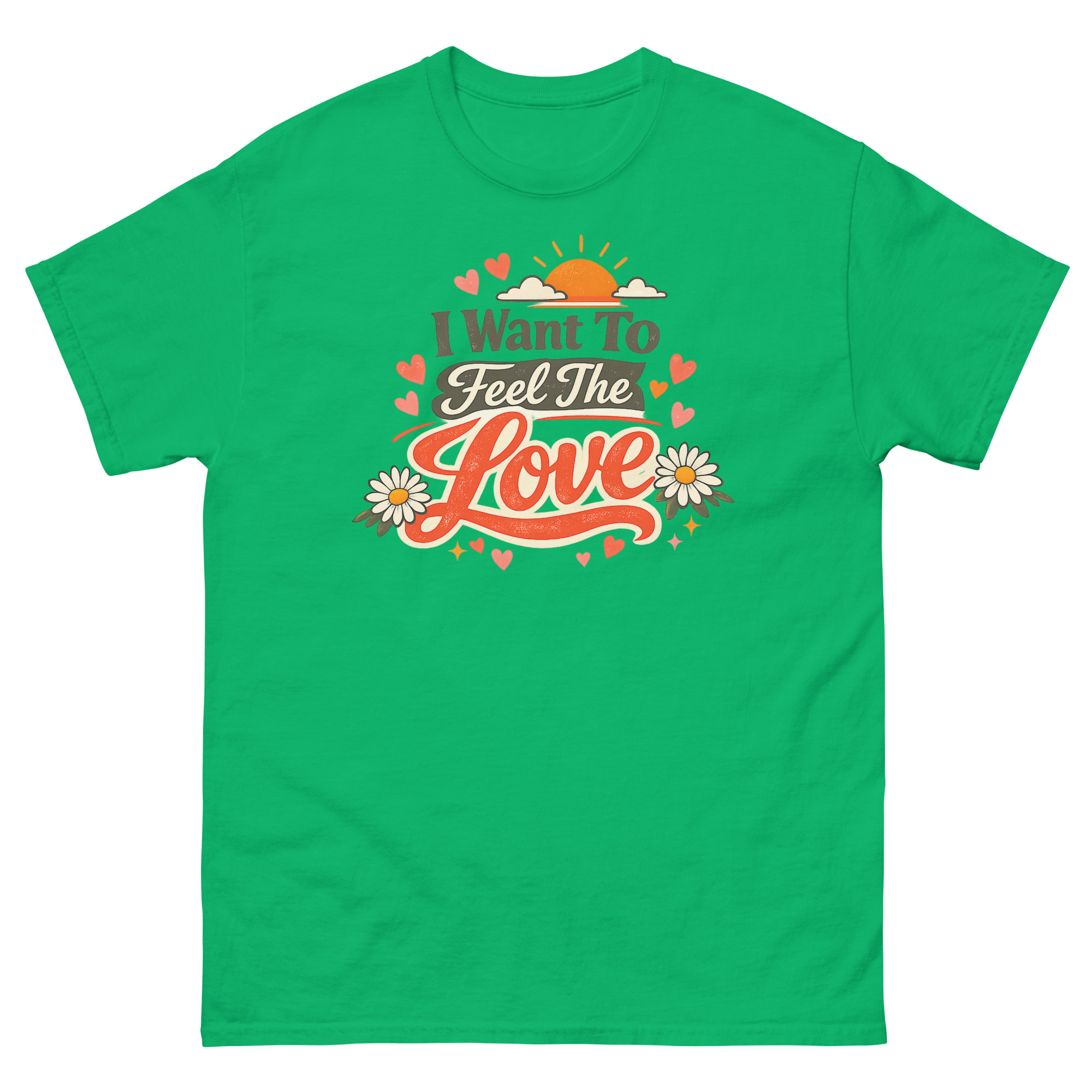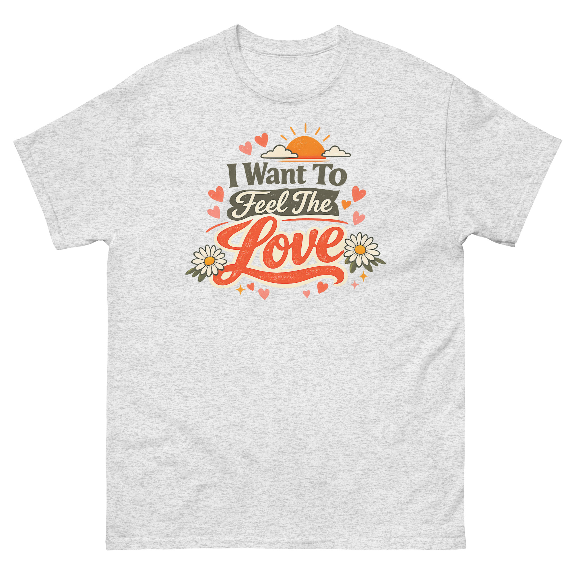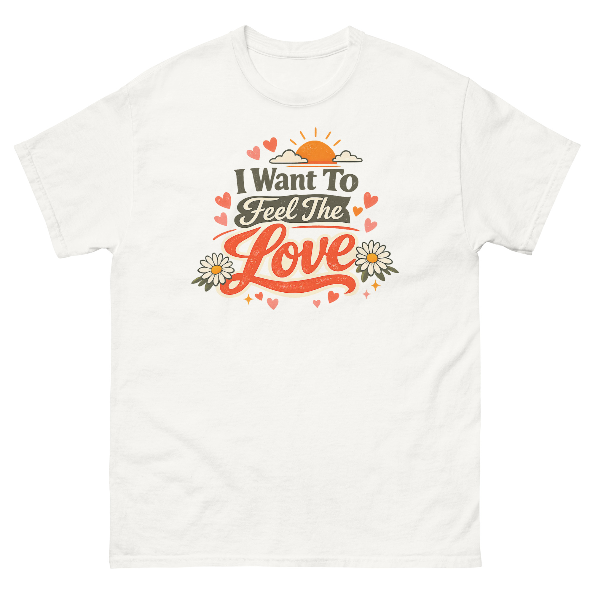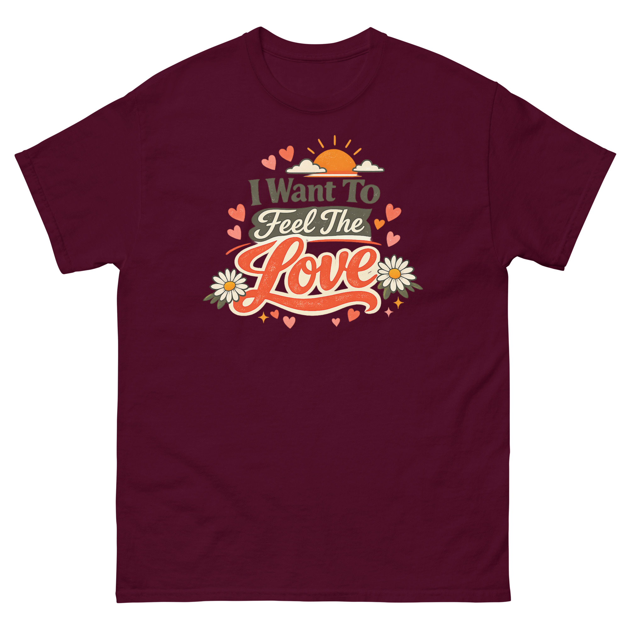 We created this I Want To Feel The Love T Shirt design for a simple reason: we missed the authentic, hand-crafted feel of old concert tees and the hopeful vibe of 70s art. Instead of a plain text quote, we built a whole sunset scene with layered fonts, daisies, and hearts to make the message “I Want To Feel The Love” feel tangible and worn-in, like a favorite find from a vintage shop. The distressed texture on the print is intentional, giving it character right from the first wear.