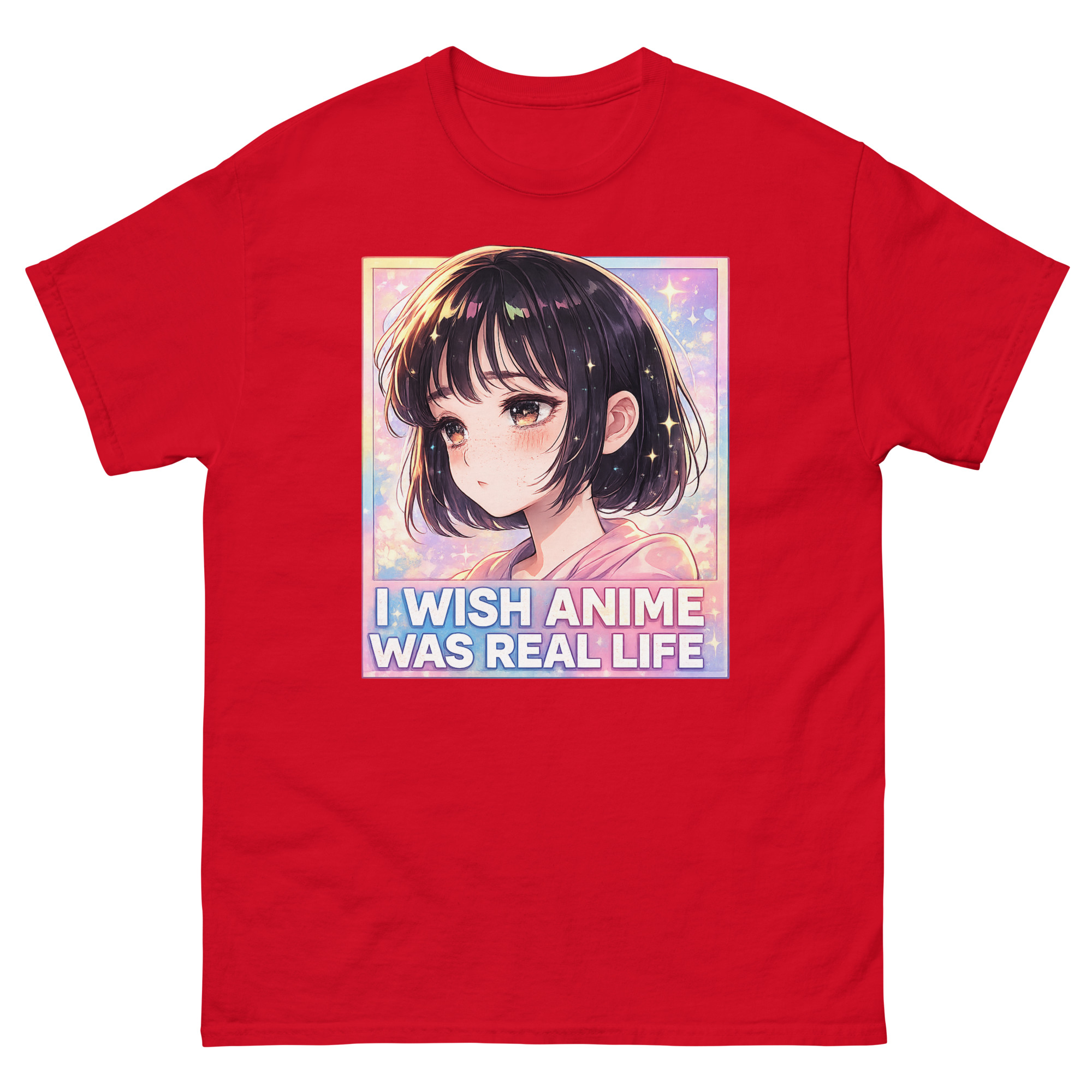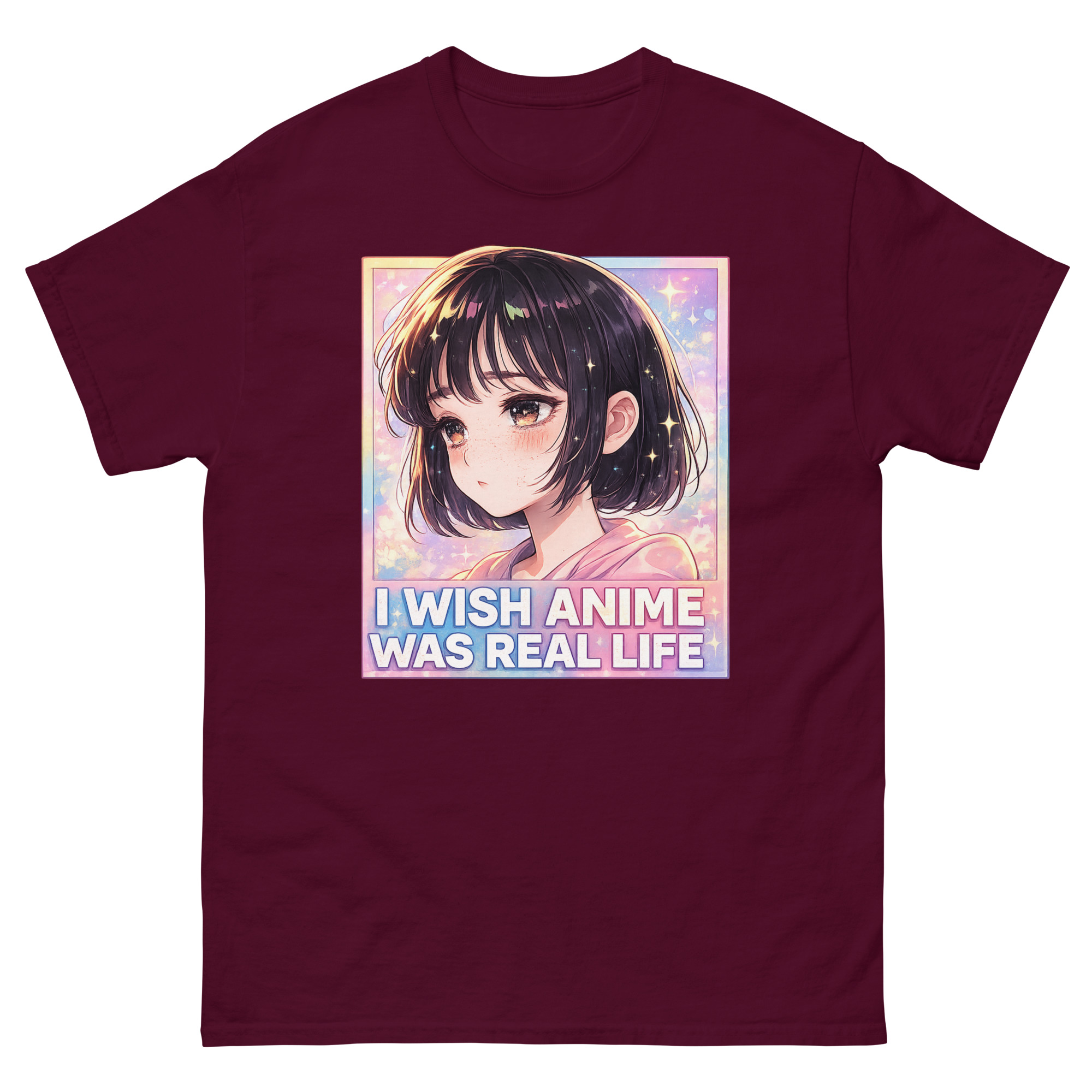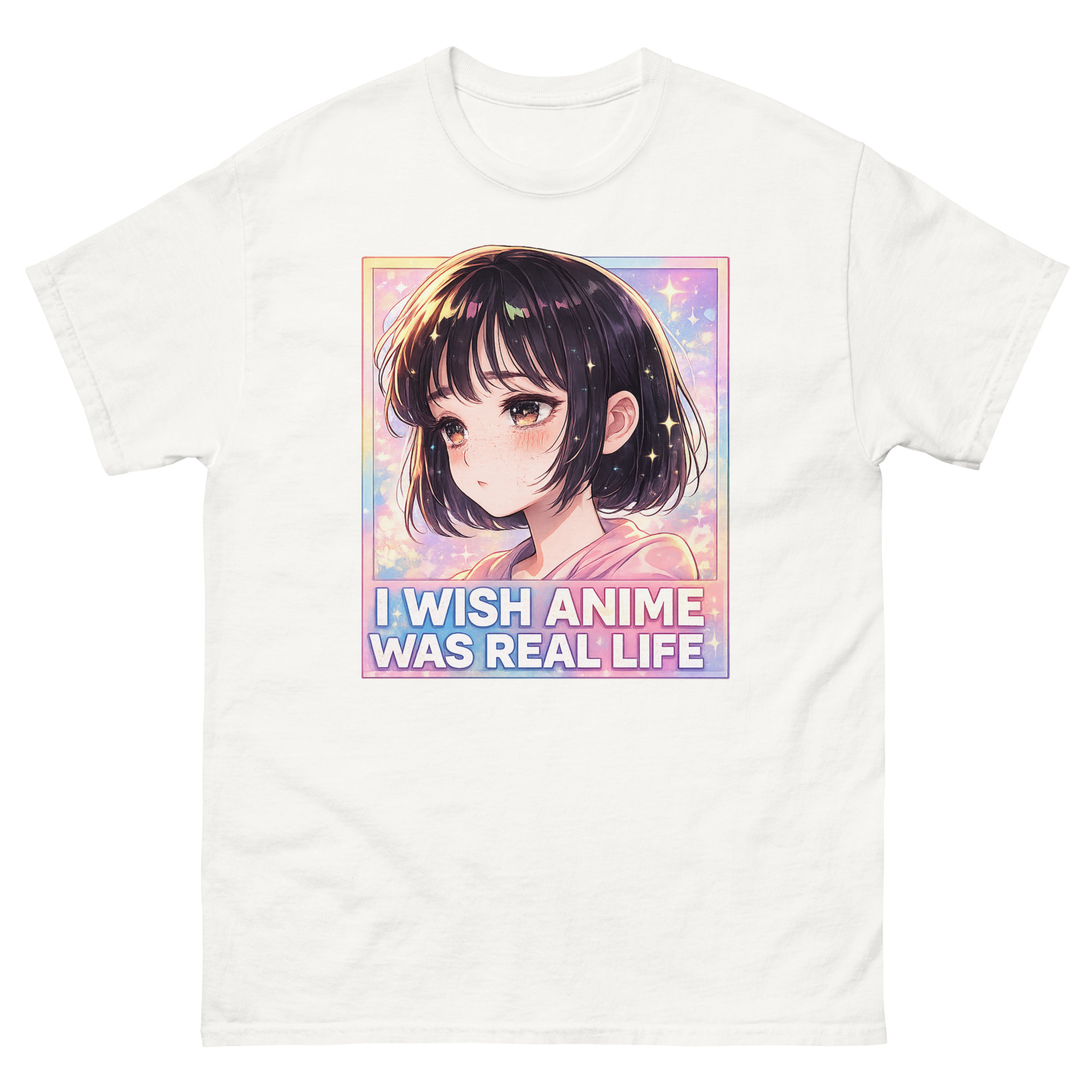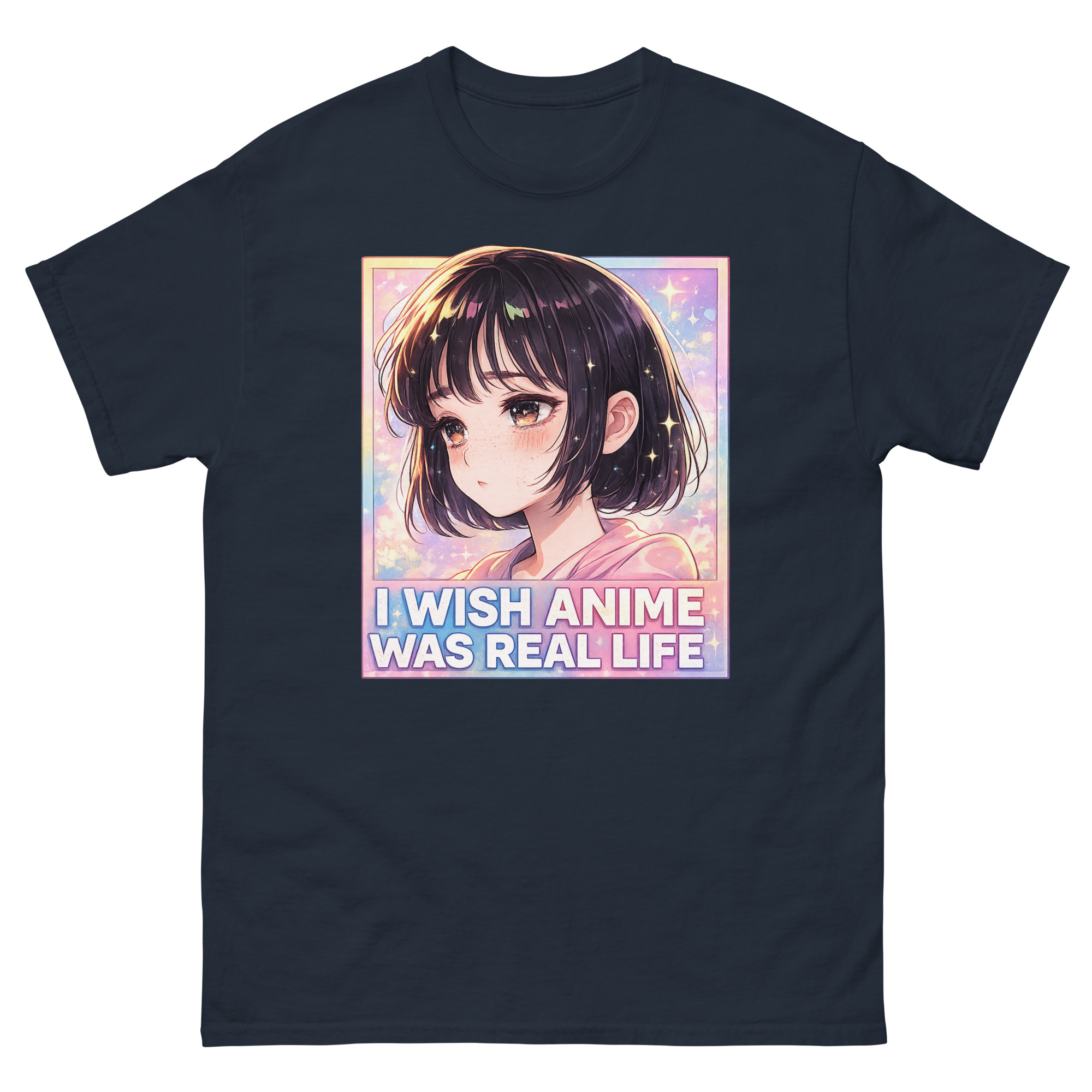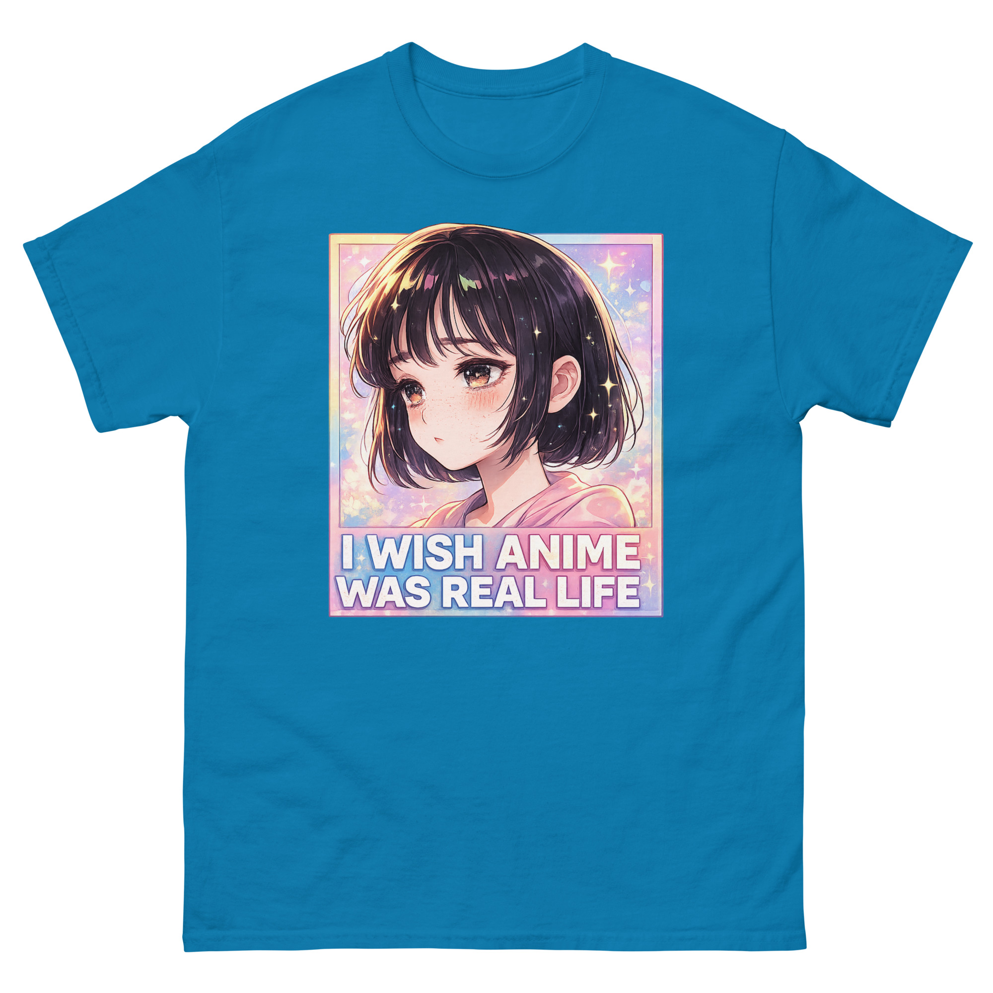 The artwork itself captures a specific mood. It features a kawaii anime girl with a wistful expression, set against a dreamy background of sparkles and stars. The phrase “I Wish Anime Was Real Life” is boldly displayed below. This visual speaks directly to the feeling of escapism, the desire to step into the vibrant, emotional world of 2D animation. Moreover, the soft girl aesthetic of the design, with its pastel pinks and blues, makes it a versatile piece for various styles.