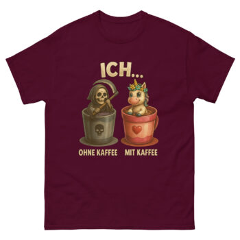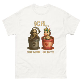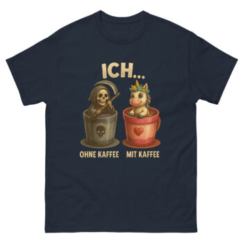 With a before and after coffee graphic tee design that speaks volumes, this shirt perfectly illustrates the dramatic shift between “Ohne Kaffee” (without coffee) and “Mit Kaffee” (with coffee). On one side, a grim reaper skull symbolizes the pre-caffeine despair; on the other, a cheerful unicorn represents pure coffee-induced bliss.