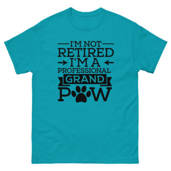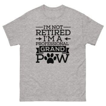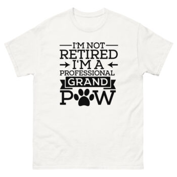 This isn’t just another funny quote on fabric. Instead, it’s a cleverly crafted statement of identity. The bold, black text makes a clear proclamation: “I’M NOT RETIRED.” Right below, the punchline lands with warmth: “I’M A PROFESSIONAL GRAND PAW.” The genius touch? A adorable paw print seamlessly replaces the “A” in “PAW.” This single visual pun fuses two proud roles into one unforgettable Grand Paw title. It’s a conversation starter that instantly connects with fellow dog lover dads and grandpas. The clean, minimalist design on light gray ensures the message pops, whether you’re at the park or a family BBQ.