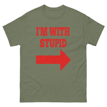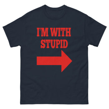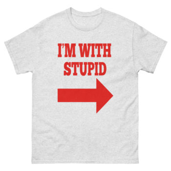 The design is bold and impossible to miss. The bold, red letters declare “I’M WITH STUPID,” while the large, graphic arrow points directly to the punchline, whoever is standing next to you. This transforms the shirt from a simple novelty graphic tee into a live-action comedy bit. Consequently, it becomes a humor statement shirt that changes its meaning depending on the situation. Whether you’re buying it as a matching joke t-shirt set or flying solo, it guarantees a reaction.