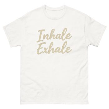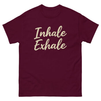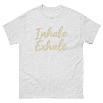 Featuring the calming phrase “Inhale Exhale” in elegant cursive script, this mindfulness breathing quote t-shirt keeps you centered, whether you’re flowing through sun salutations, sitting in stillness, or simply navigating life’s daily stresses.