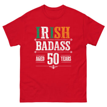 Let’s be clear: this is not just another green t-shirt. This is a funny Irish pride milestone t shirt designed with intentionality. The bold, distressed text “IRISH BADASS AGED 50 YEARS” isn’t merely a phrase; it’s an identity. The design cleverly incorporates the green, white, and orange of the Irish flag directly into the word “IRISH,” creating a powerful, emblematic statement. This nuanced detail transforms it from simple apparel into a wearable piece of cultural pride, making it the definitive Irish 50th birthday shirt for a true Celt.