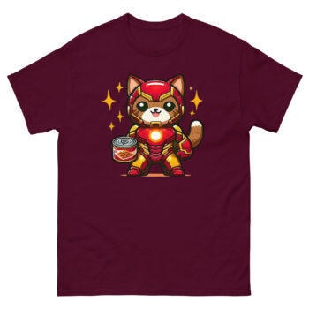 Let’s be honest, our cats already act like they’re the center of the universe. So, why not dress the part? This cute superhero cat graphic tee features a feline decked out in iconic red and gold armor, ready for a mission. But the real power source? It’s not an arc reactor—it’s the trusty can of cat food he holds like a prized trophy. This hilarious twist makes it the perfect iron cat shirt gift for Marvel fans who also happen to serve a feline overlord.