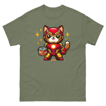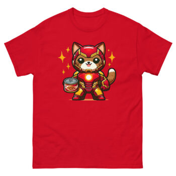 The Iron Man Cat Shirt blends superhero style with feline fun! Featuring an adorable cat in red and gold armor holding a can of cat food, this parody tee is a must-have for cat lovers and comic fans alike.