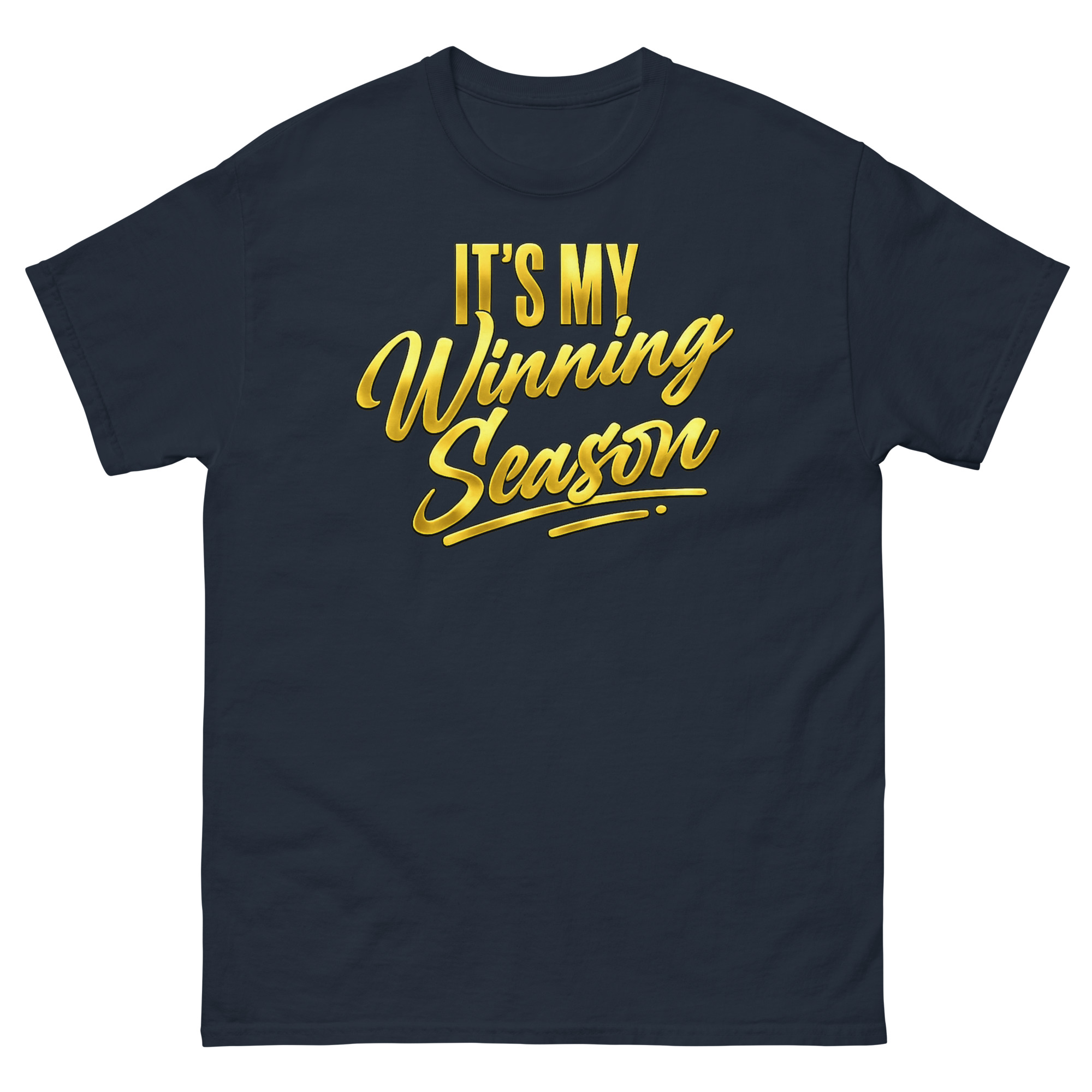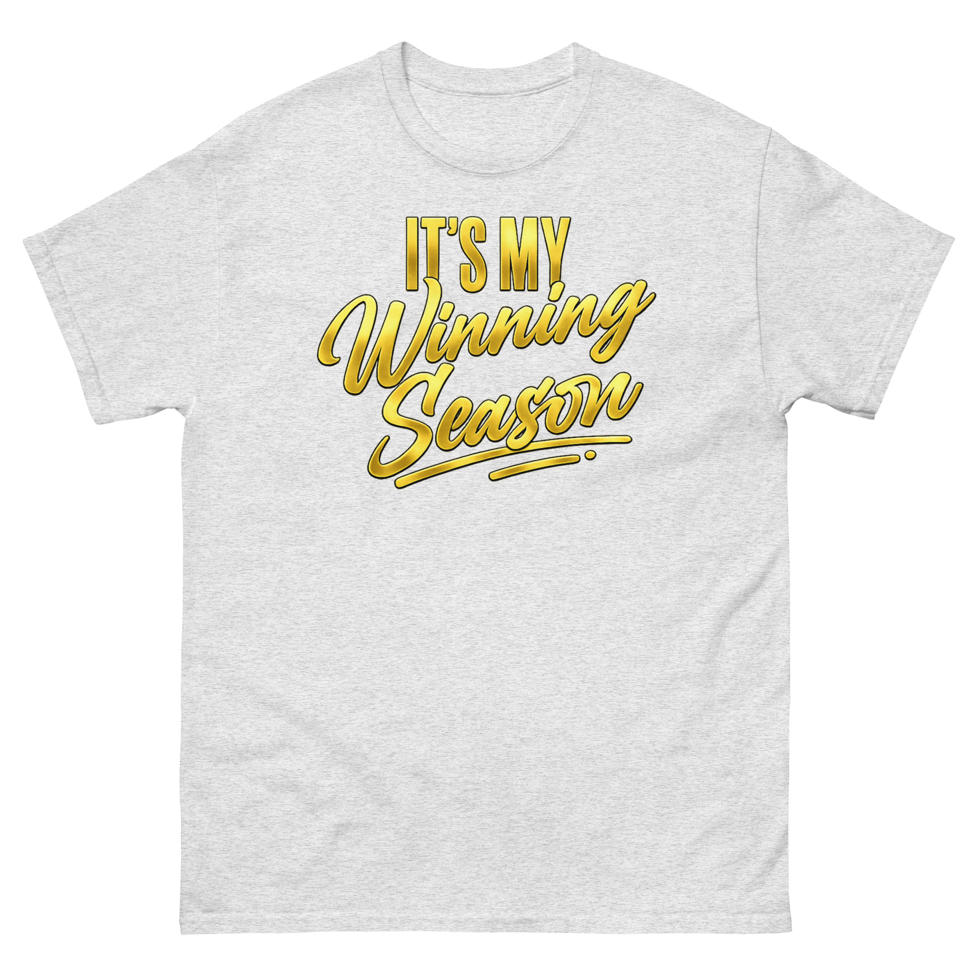 The It’s My Winning Season Shirt is a classic cotton tee featuring a bold, two-part design with a metallic gold script that commands attention. Its unique combination of strong block letters and a luxurious golden flourish makes it a standout piece of motivational empowerment apparel. This shirt is designed for anyone claiming their moment of success, from new entrepreneurs to graduating students.